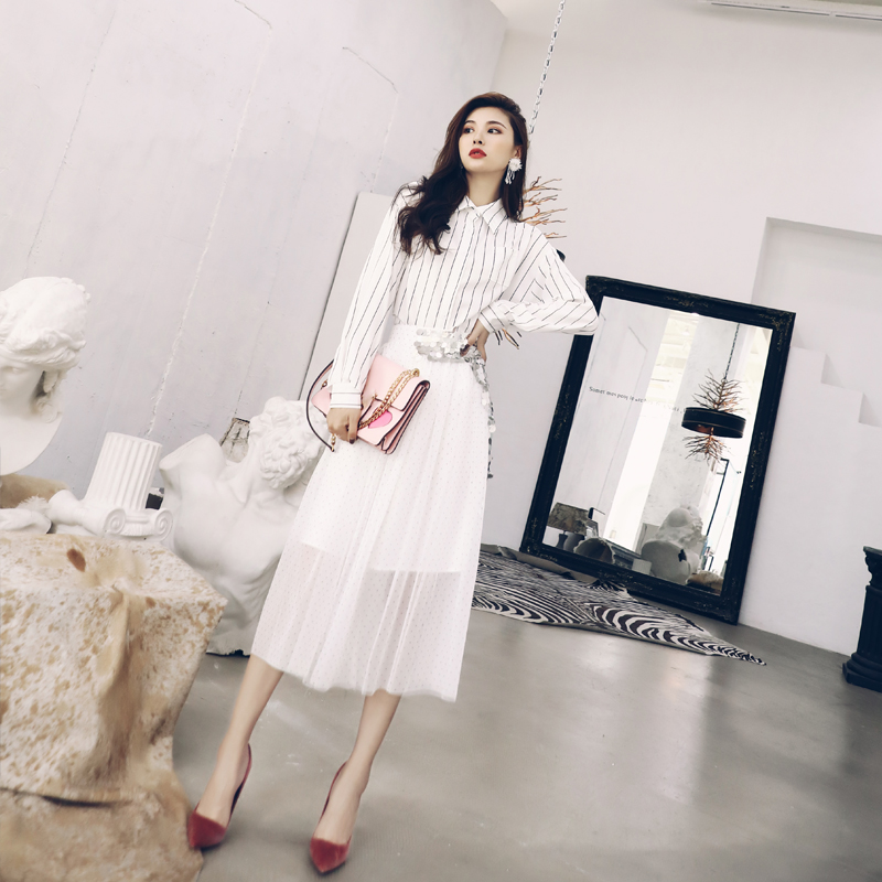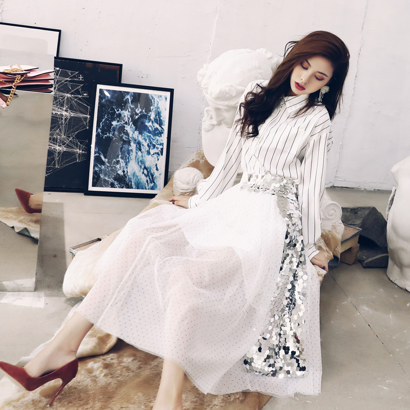 / 名媛氣質韓版豎條紋長袖襯衫亮片網紗半身裙兩件女秋收腰修身套裝