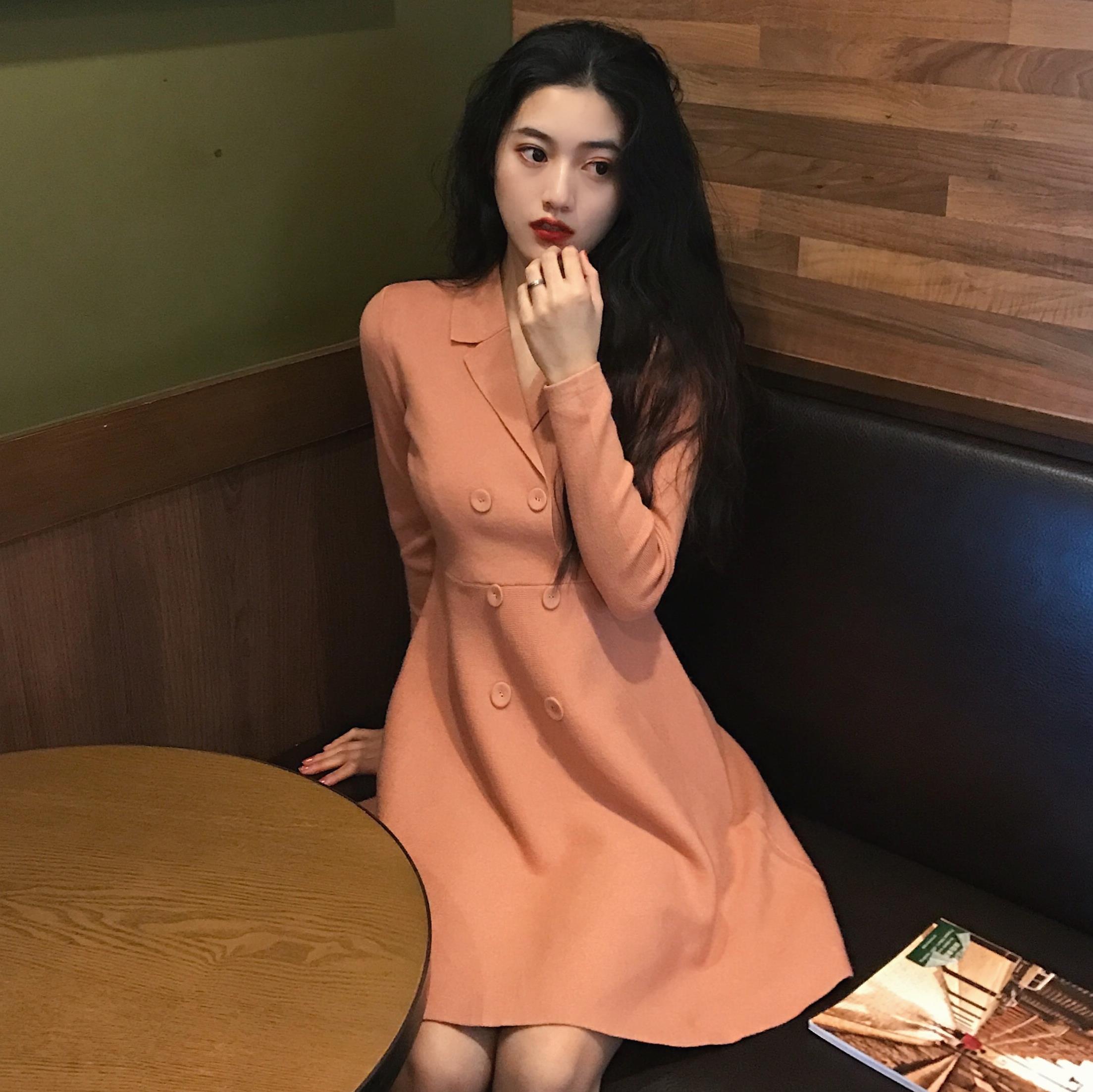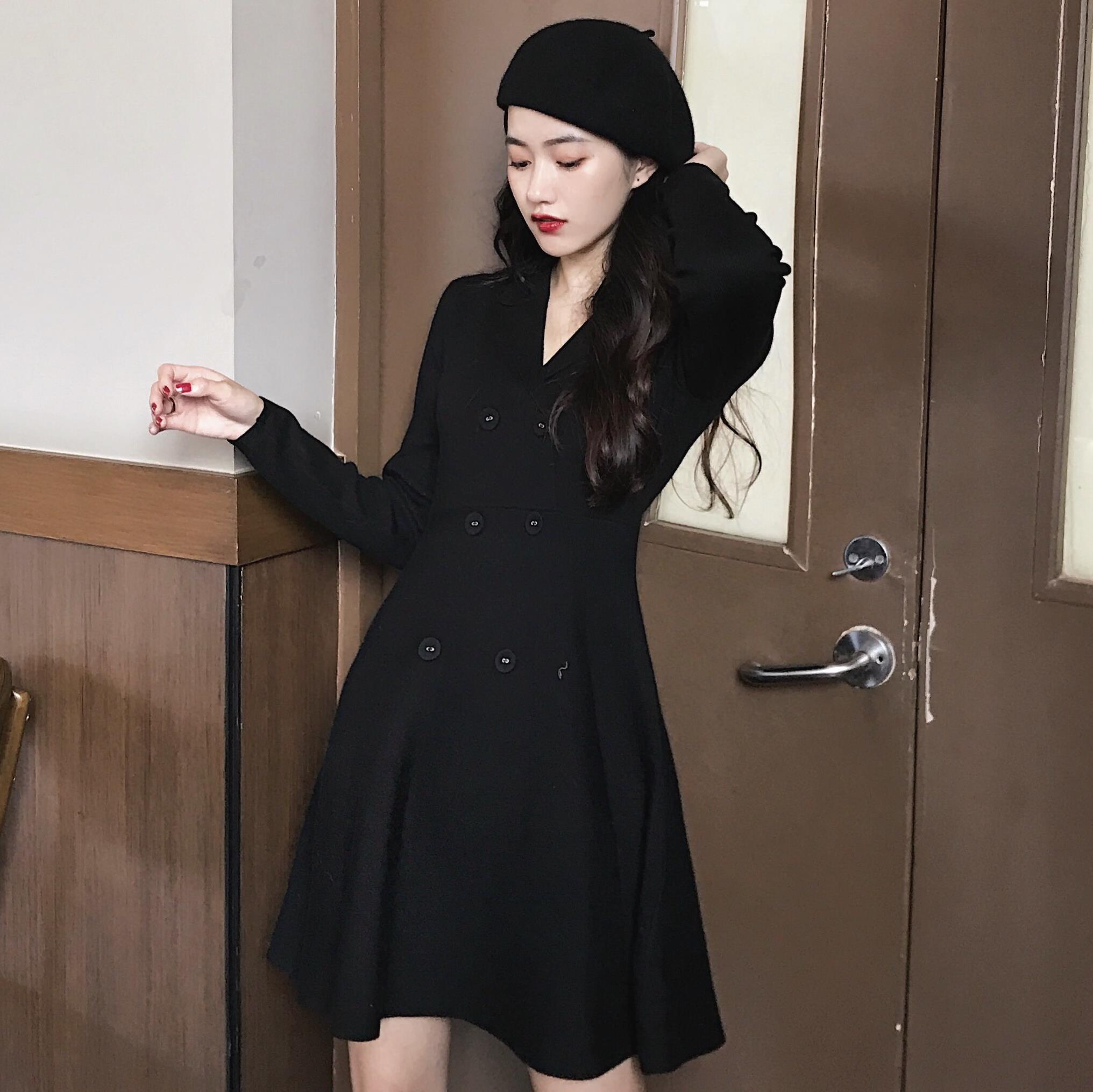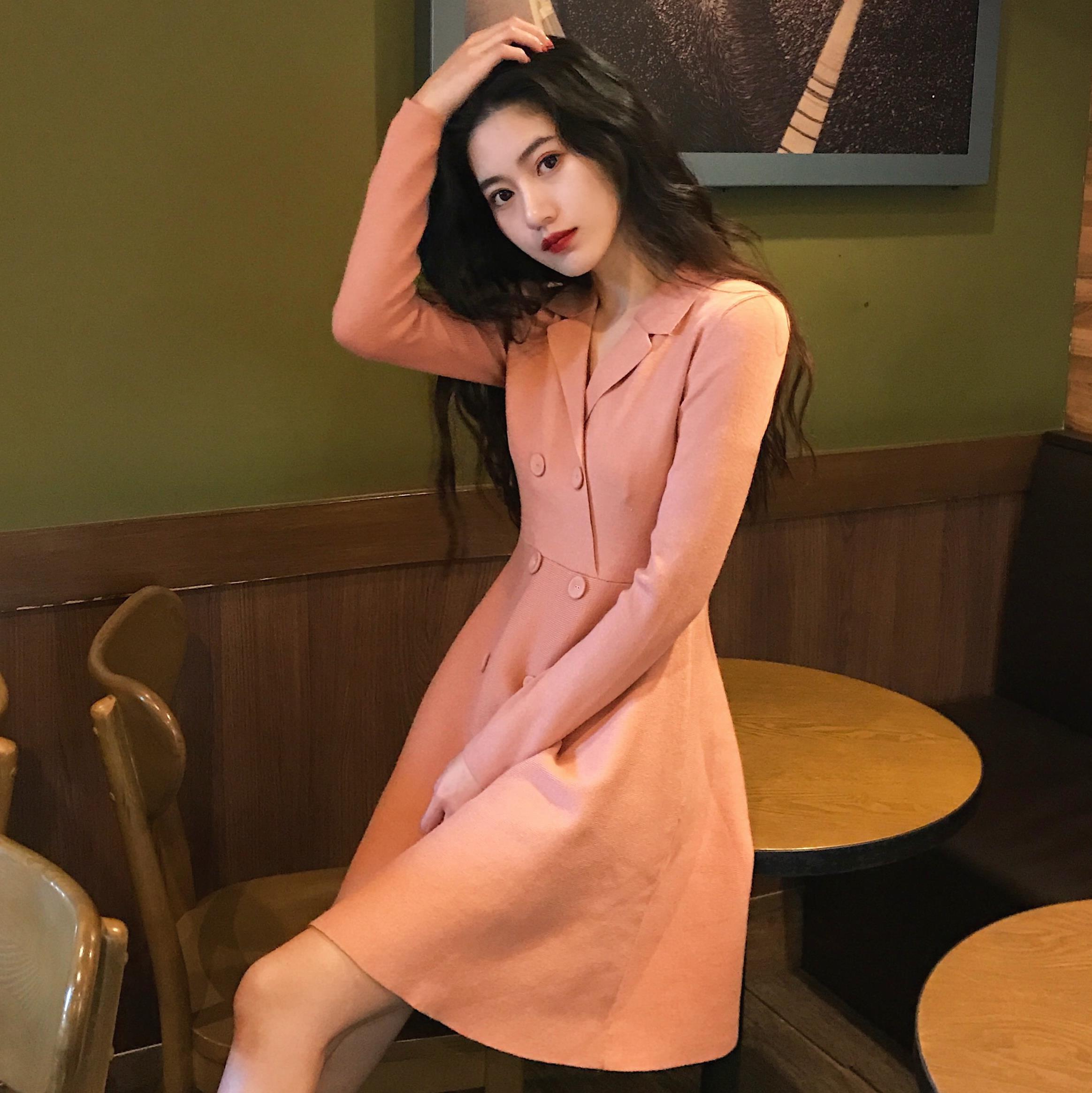 / 新款韓版chic百搭簡約甜美氣質A字裙修身顯瘦小翻領高腰連衣裙女