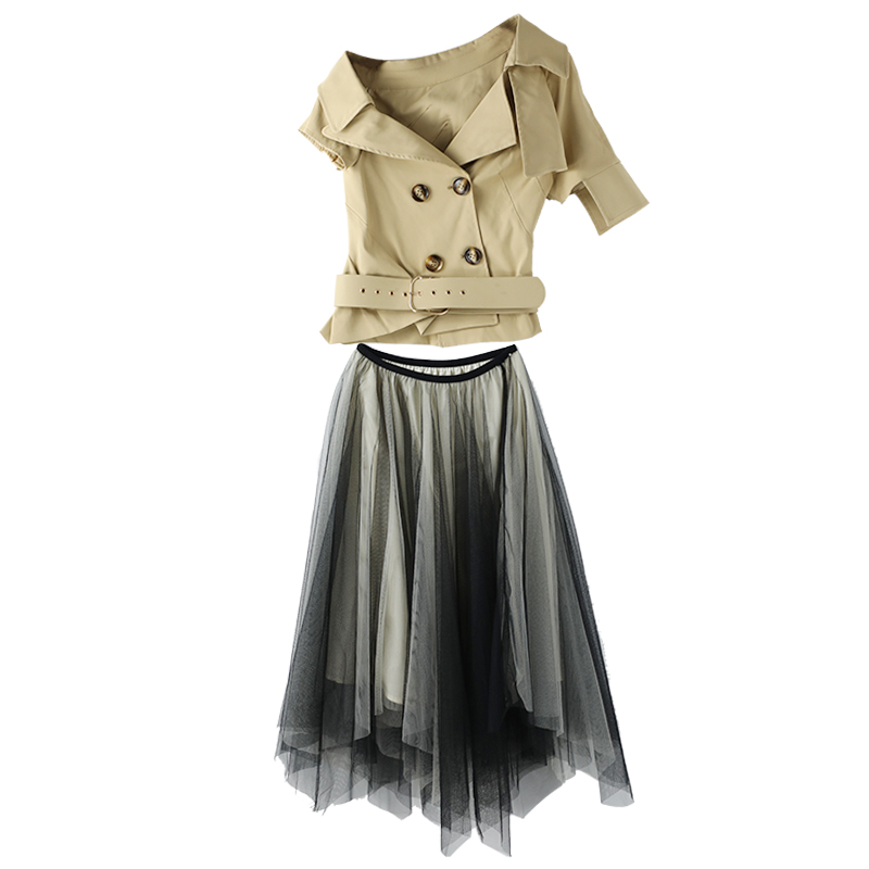 / 溫柔名媛歐洲站露肩上衣套裝女夏2018新款時尚網紗半身裙兩件套潮