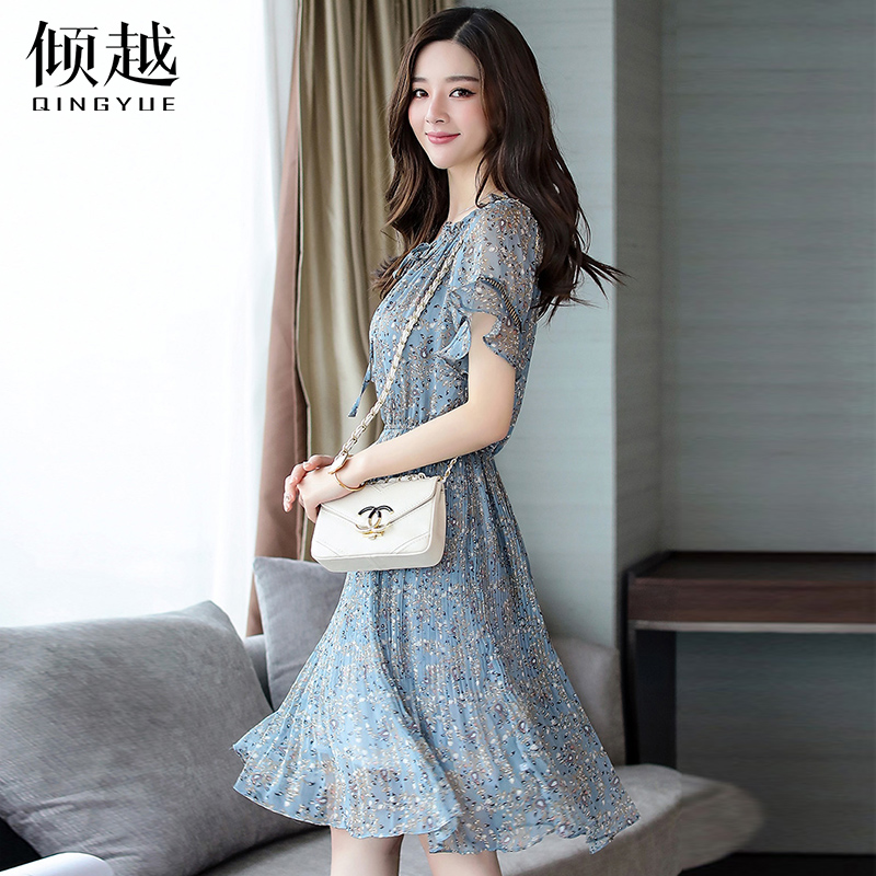 / 氣質淑女碎花百褶雪紡連衣裙喇叭袖2017新款收腰顯瘦小花裙子夏潮