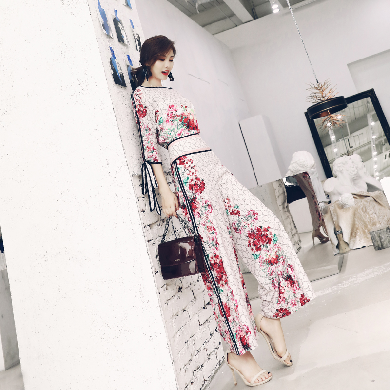 名媛氣質復古2018新款女夏顯瘦高腰闊腿褲七分袖上衣洋氣印花套裝