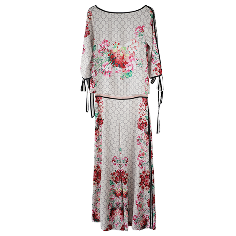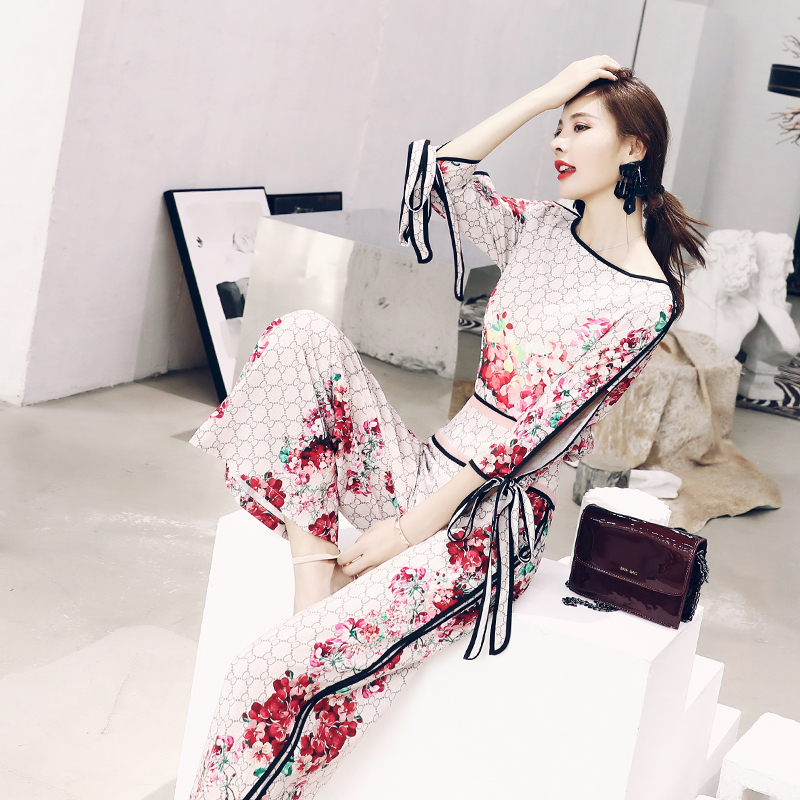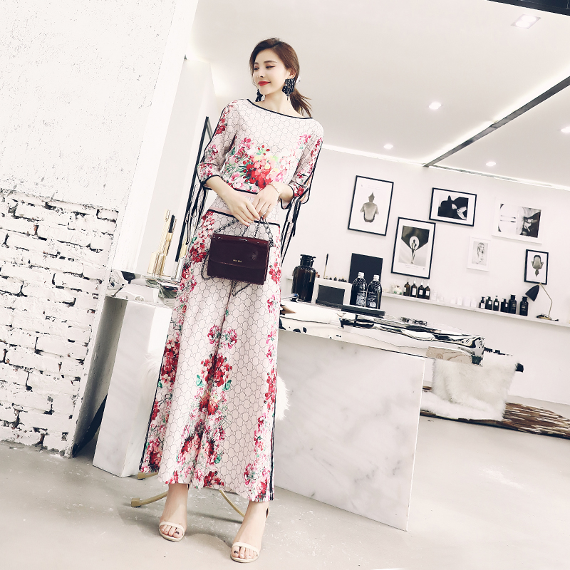 / 名媛氣質復古2018新款女夏顯瘦高腰闊腿褲七分袖上衣洋氣印花套裝