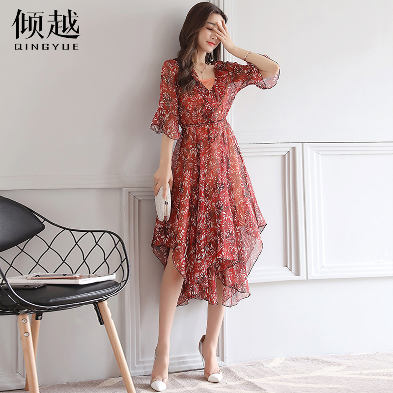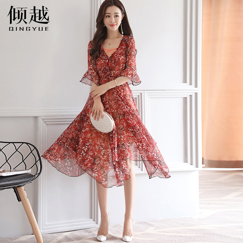 / 2017夏裝新款女裝氣質顯瘦V領中長款裙子碎花喇叭袖雪紡連衣裙女
