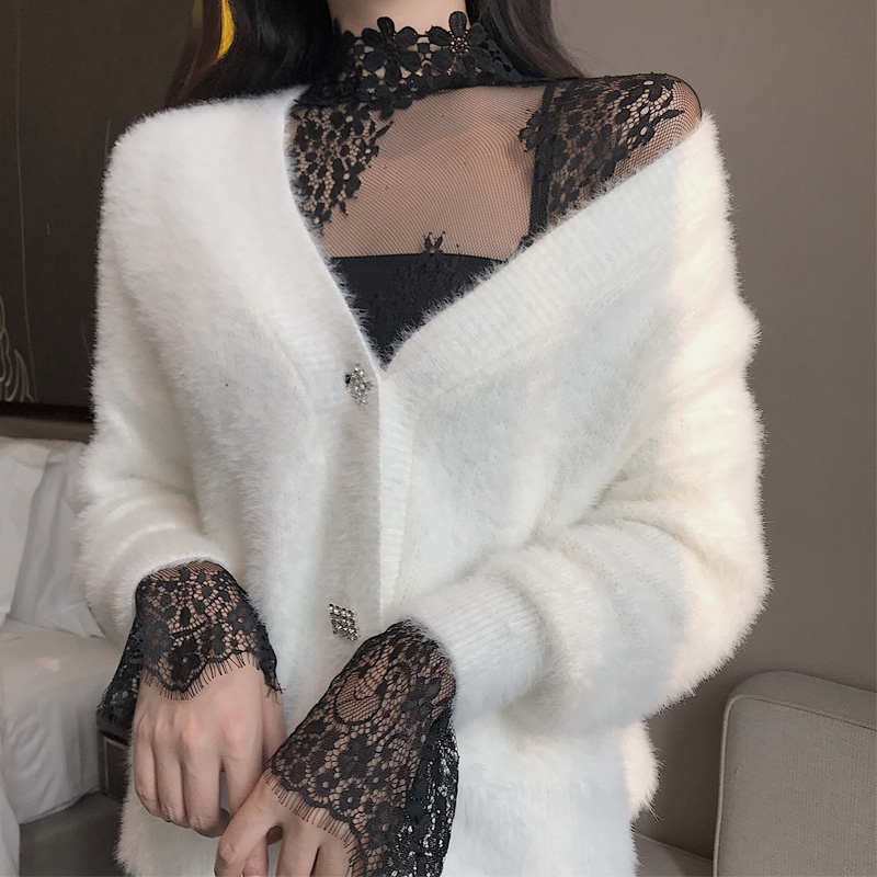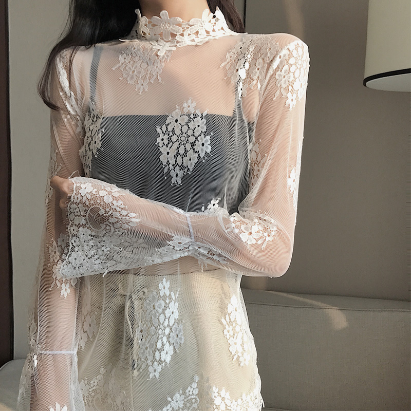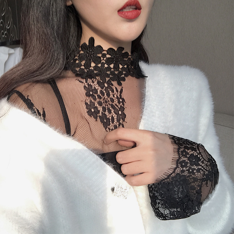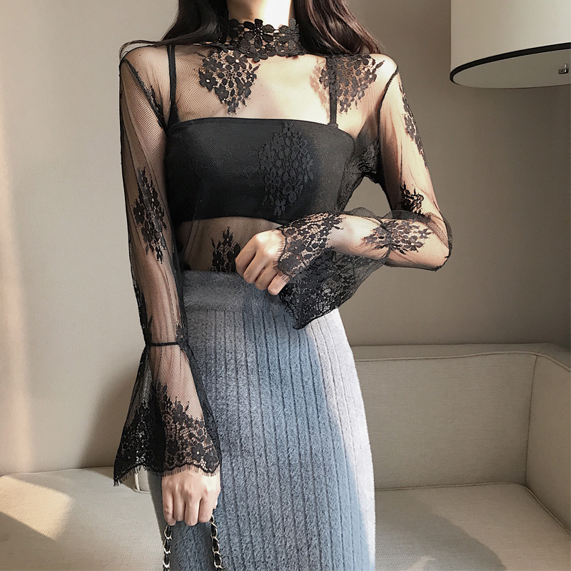 / 港味秋冬性感透視蕾絲花邊打底衫鏤空高領網紗喇叭袖內搭上衣女潮