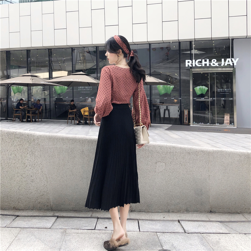 / 新款百搭復古波點襯衫配頭巾A字針織百褶裙港風時尚套裝兩件套女