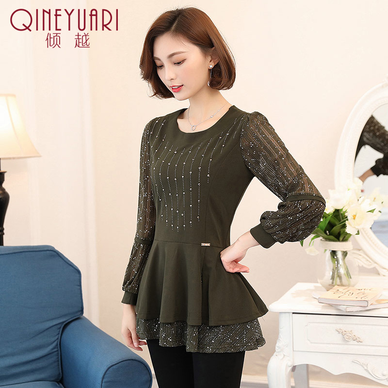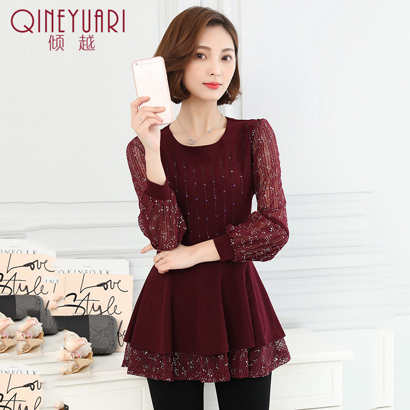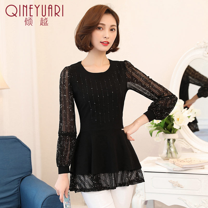/ 傾越2017春裝新款女裝潮蕾絲打底衫女士長袖中長款春季雪紡衫上衣