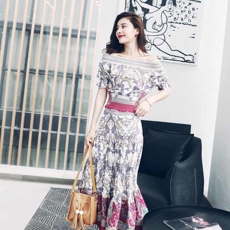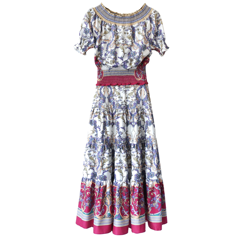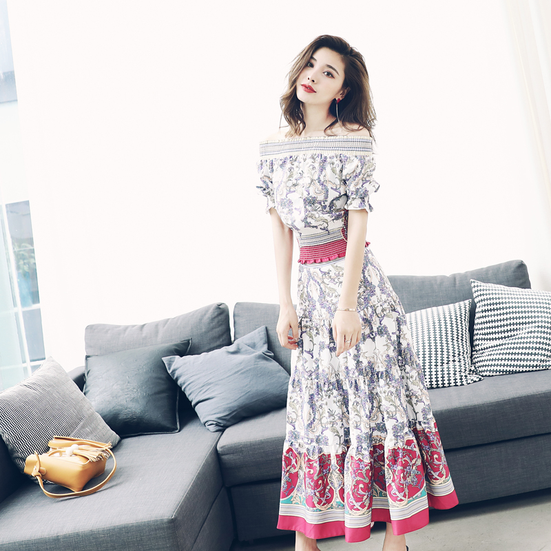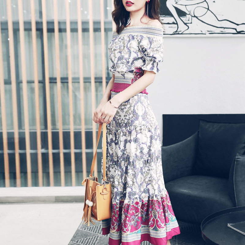 S秀2018夏季新款仙女氣質超仙短袖中長裙收腰顯瘦一字領碎花裙