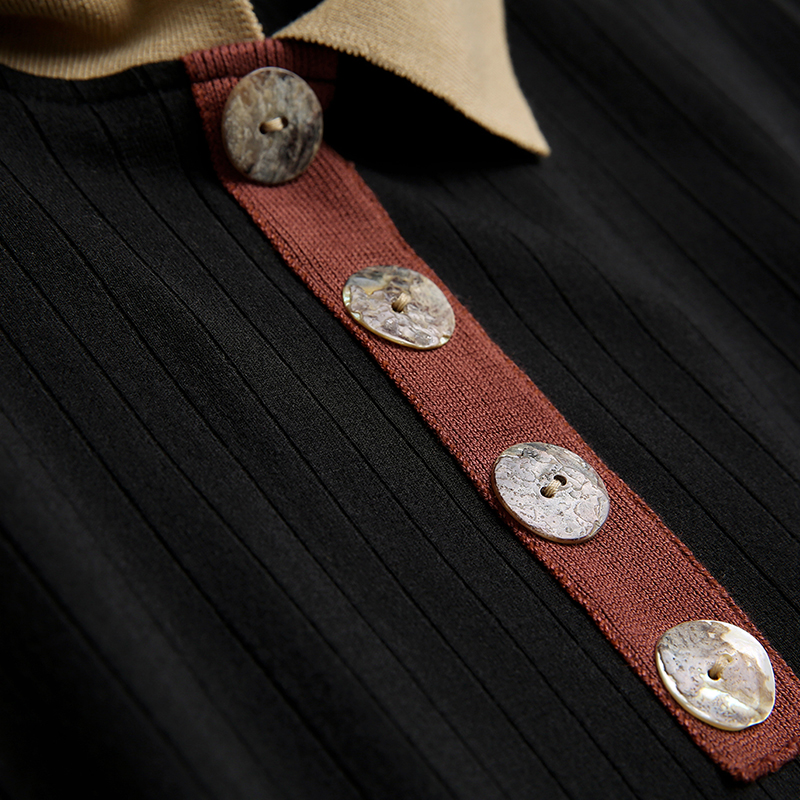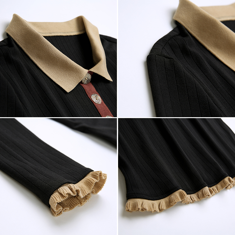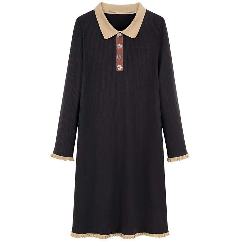 MG小象修身針織連衣裙女秋長袖polo領2018新款中長款黑色內搭裙子