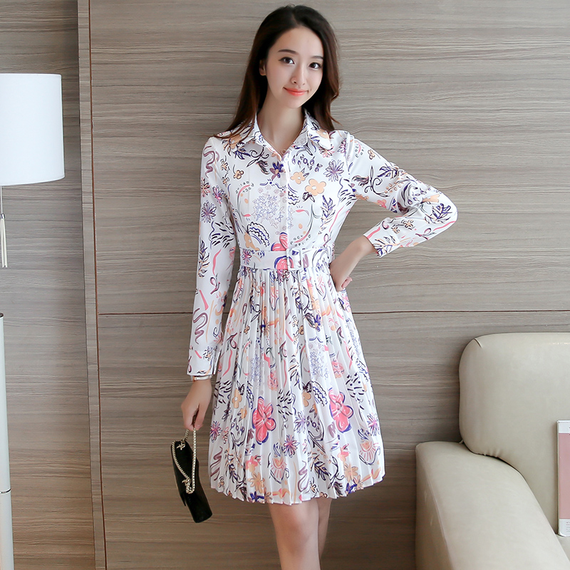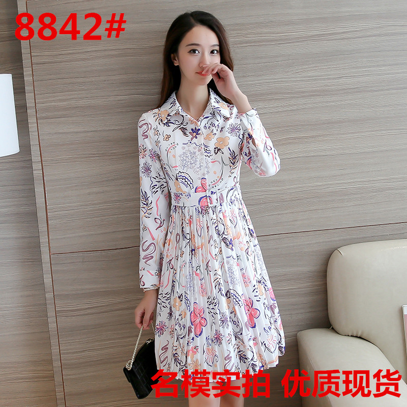 / 春季新款百搭素雅百褶秋裝長袖復古印花修身時尚打底連衣裙女