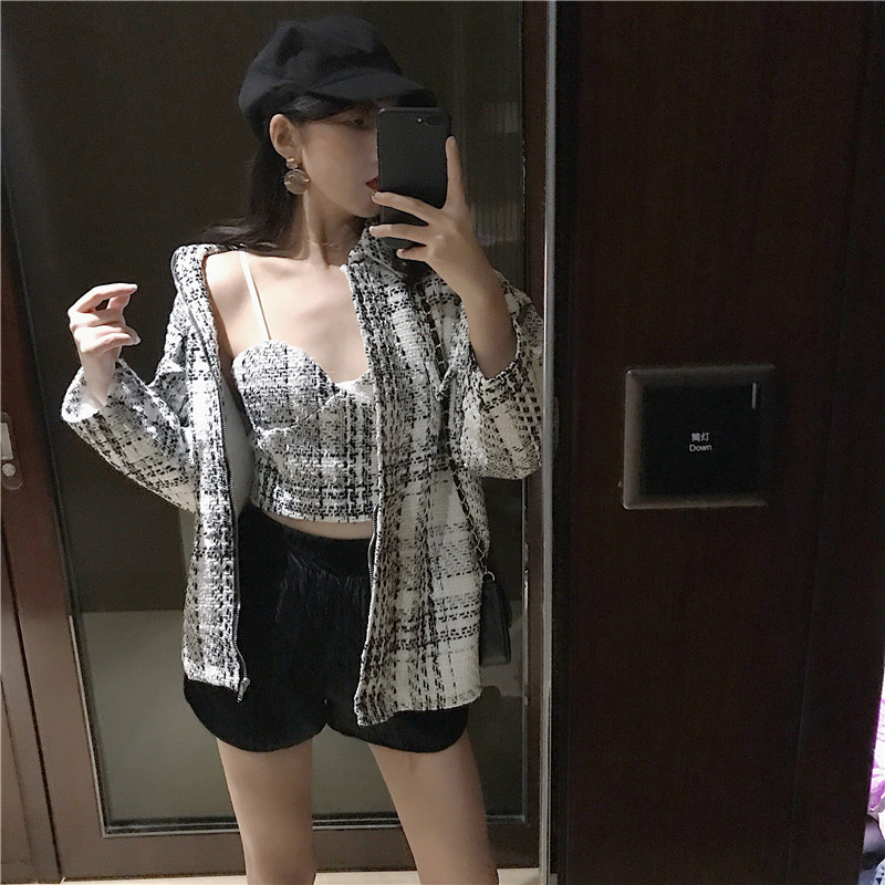 時尚小香風套裝女秋冬2018新款修身打底背心+長袖百搭粗花呢外套