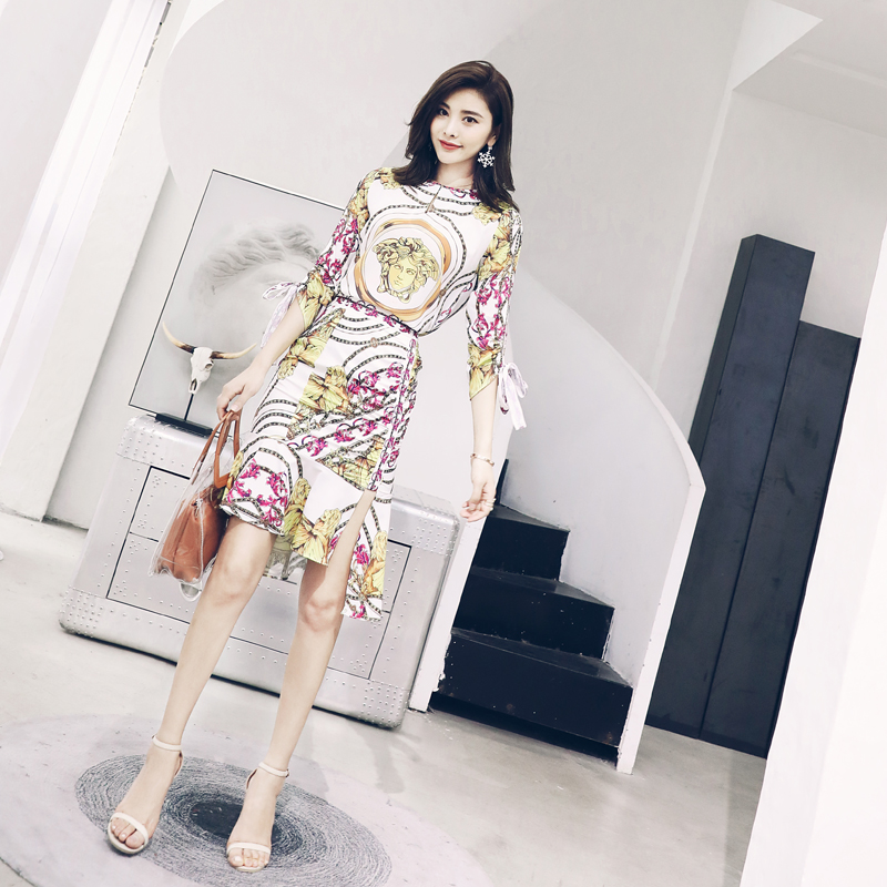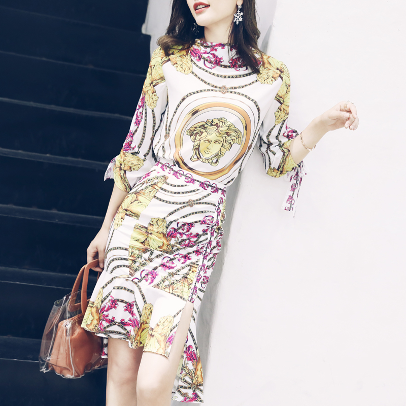 / 歐洲站名媛套裝夏季2018新款印花蝴蝶結上衣開叉半裙時尚兩件套潮