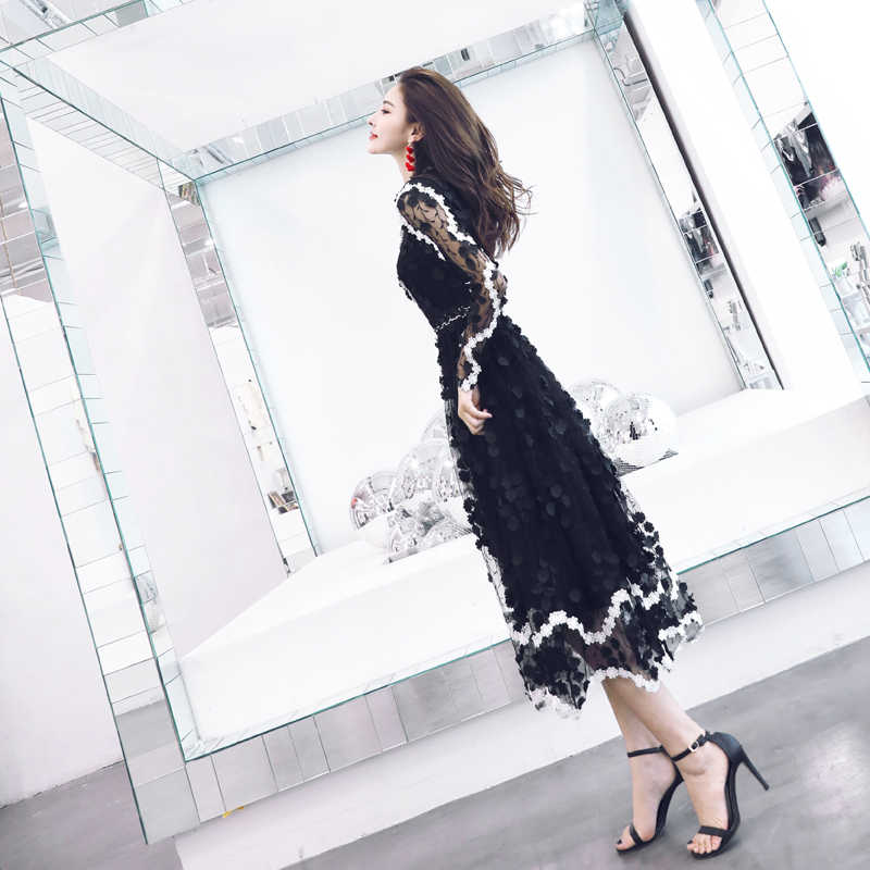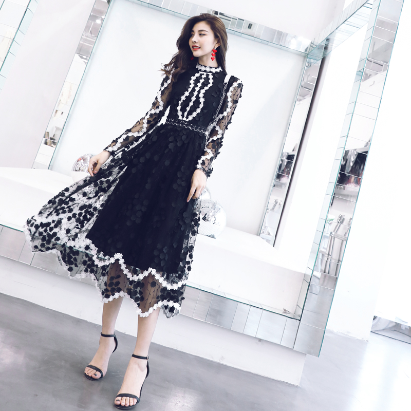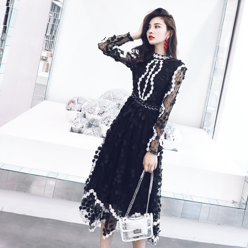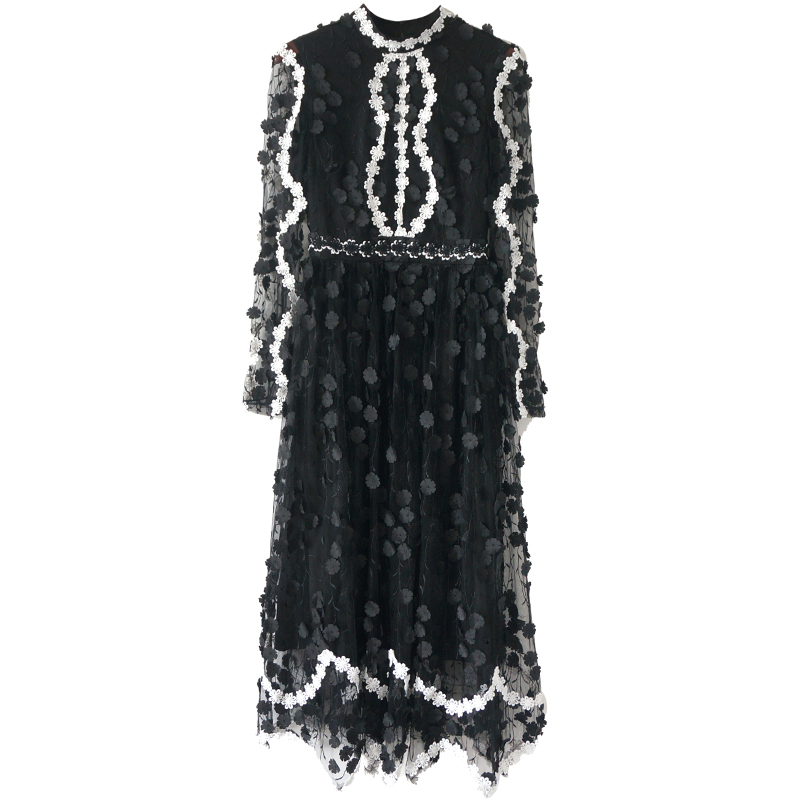 名媛氣質夏高端減齡重工蕾絲刺繡手工花朵網紗顯瘦公主仙女連衣裙