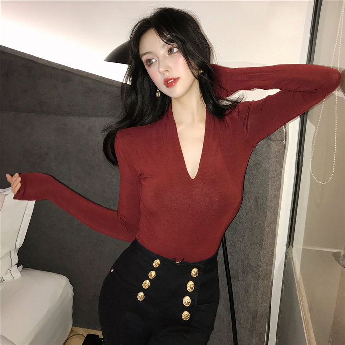 / 復古冬裝上衣女慵懶長袖t袖女百搭加厚純棉氣質v領顯瘦修身打底衫