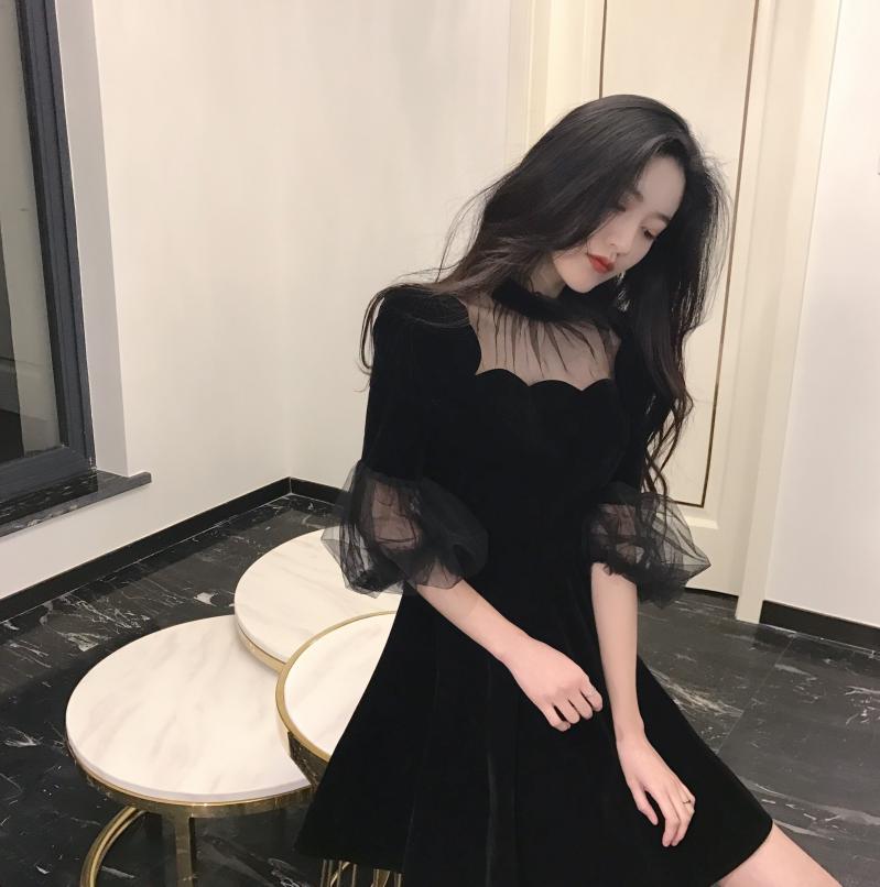 2018女夏新款韓版五分袖收腰顯瘦百搭復古chic網紗拼接a字連衣裙