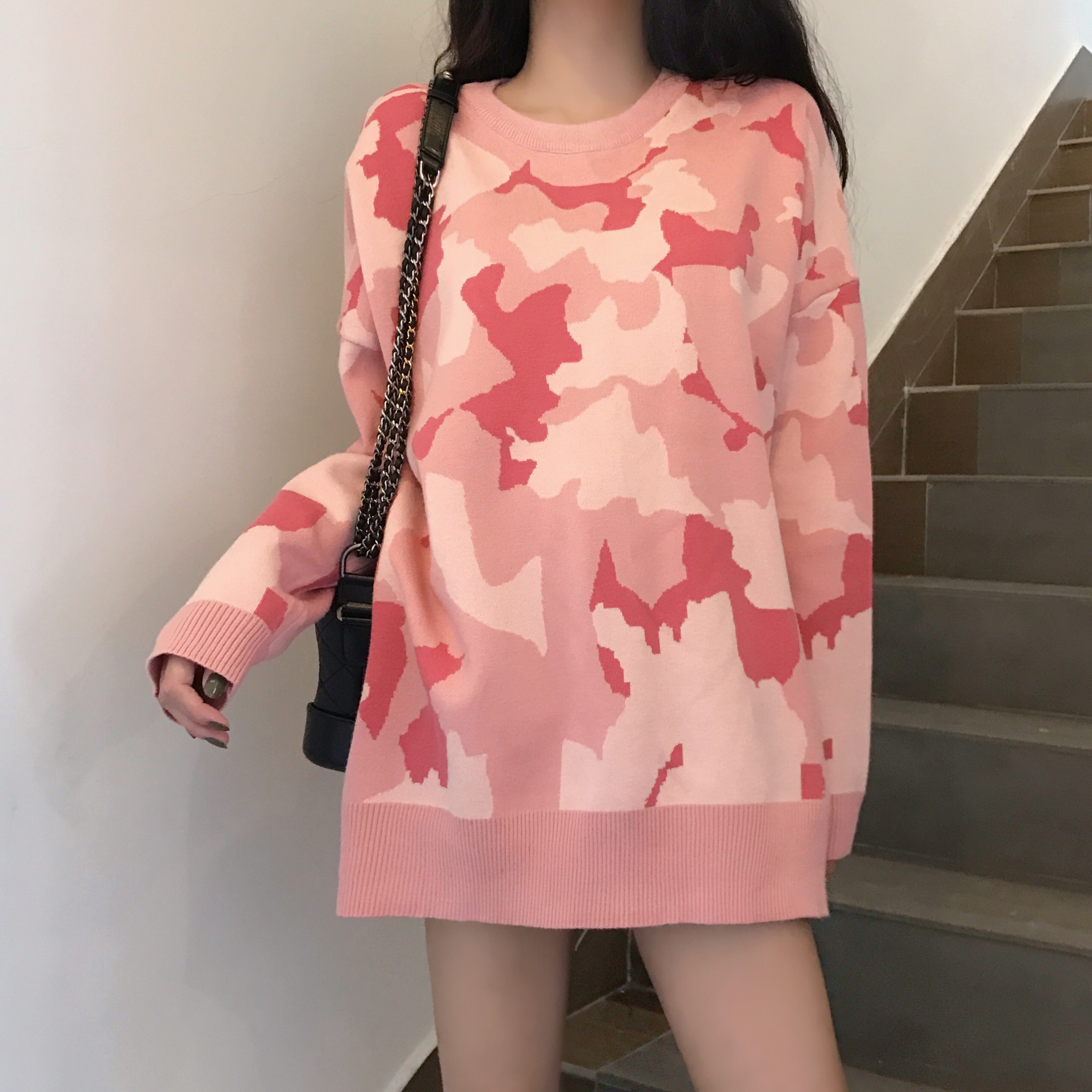 韓版2018秋裝新款迷彩套頭針織衫慵懶風寬松oversize中長款毛衣女