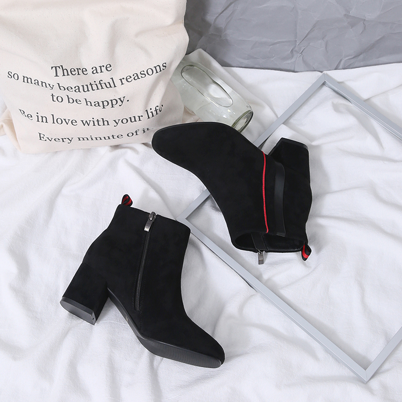 MG小象拼色粗跟高跟鞋女韓版磨砂圓頭馬丁靴2018秋冬新款個性短靴