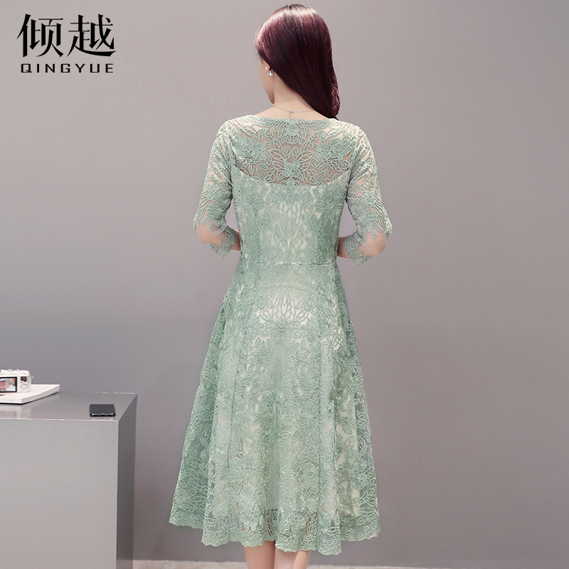傾越2017春季新款韓版鏤空蕾絲裙修身中長款A字七分袖套頭連衣裙
