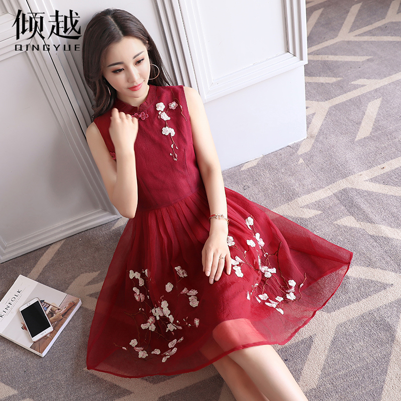 / 2017夏裝韓版新款女裝修身氣質歐根紗刺繡復古中長款無袖連衣裙潮