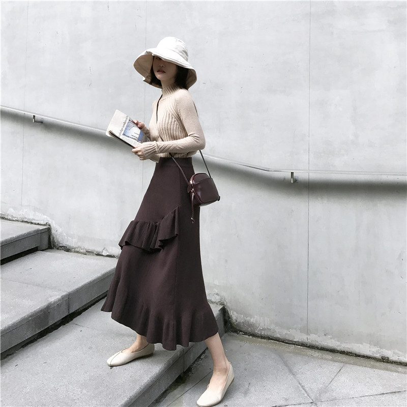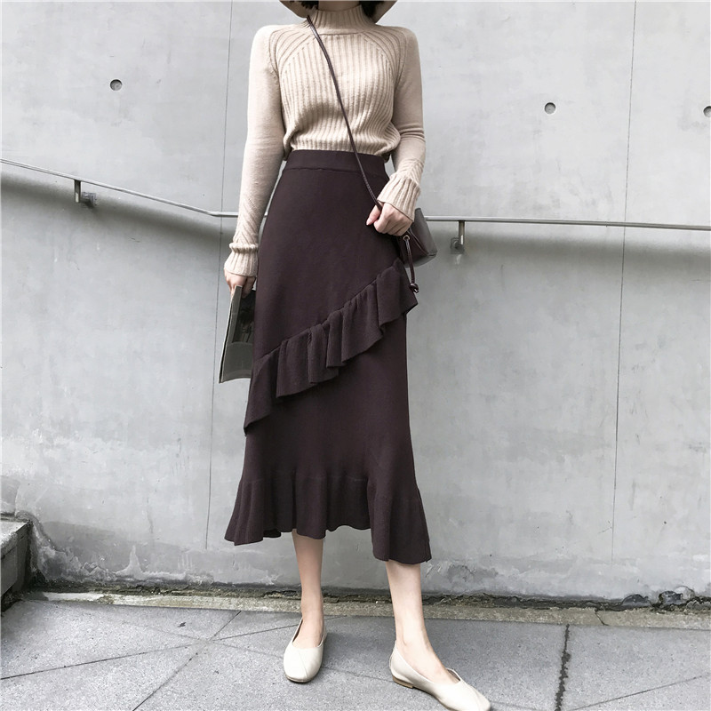 / 港味時尚百搭A字裙秋季新款韓版chic針織高腰中長款荷葉邊半身裙