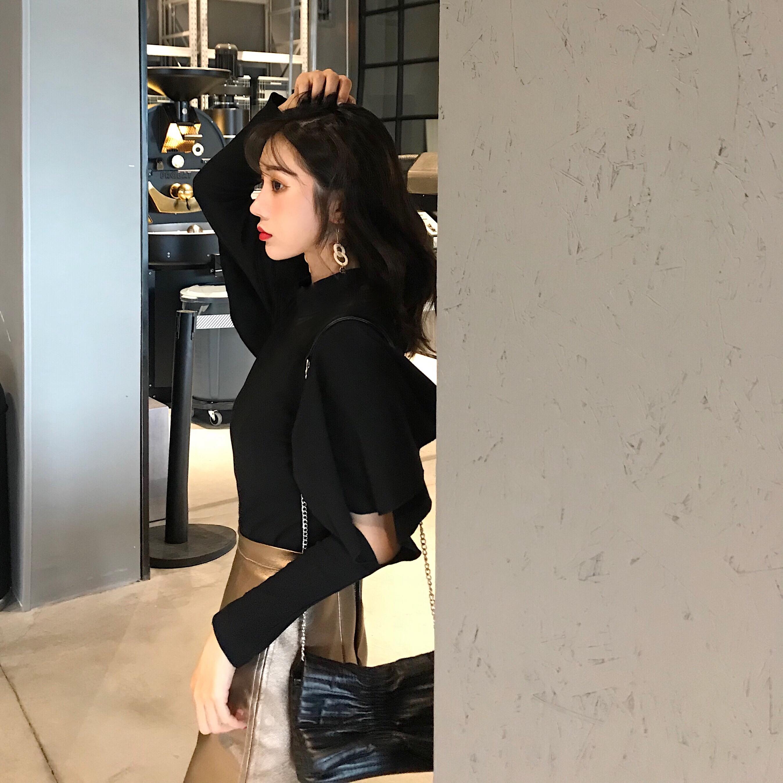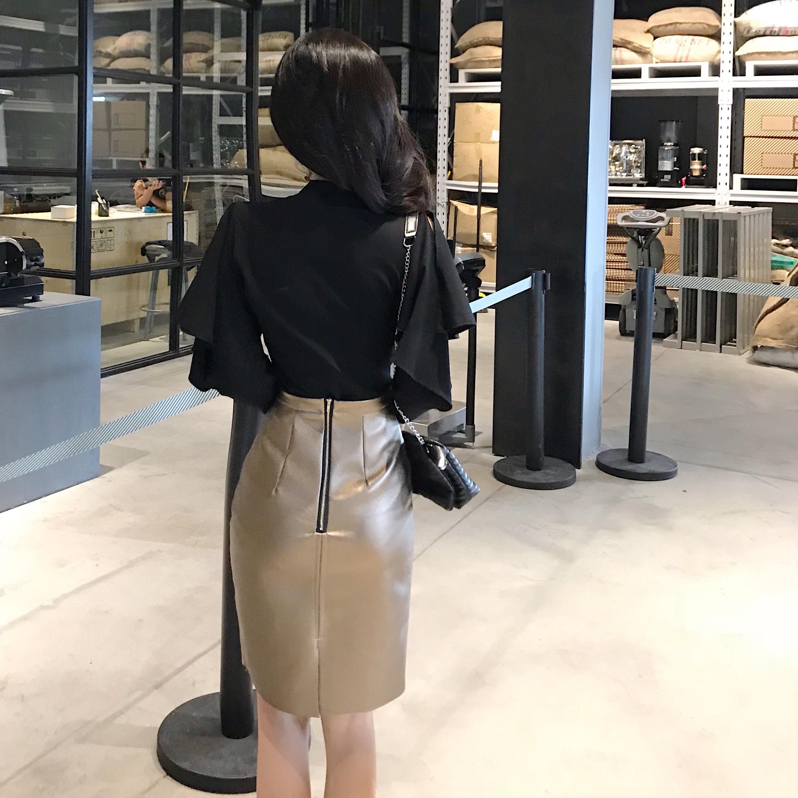 / 秋裝2018新款韓版時尚套裝氣質露肩圓領T恤高腰百搭皮裙兩件套女