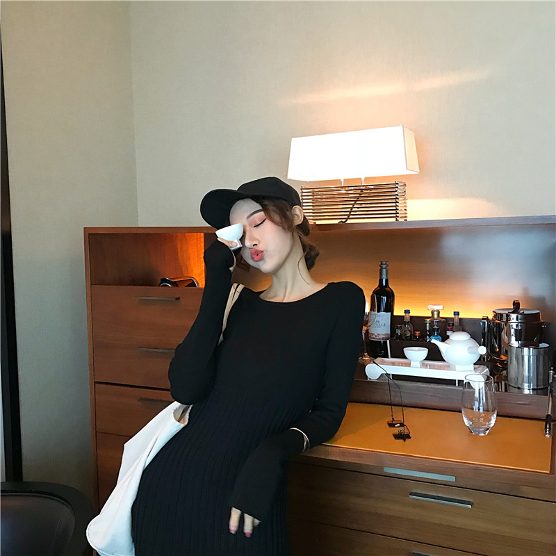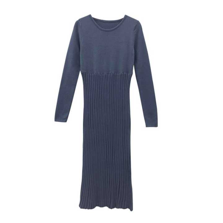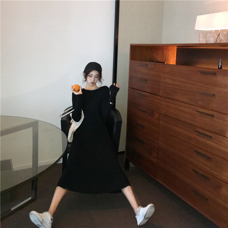 新品chic氣質收腰復古修身顯身材針織時尚設計感百褶大擺連衣裙潮