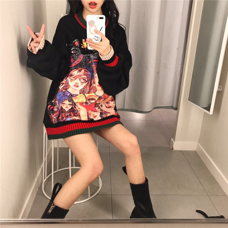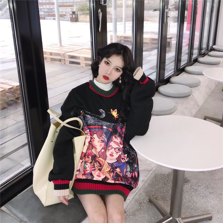 / 港味新款秋季chic上衣女個性繪畫印花寬松撞色中長款加絨套頭衛衣