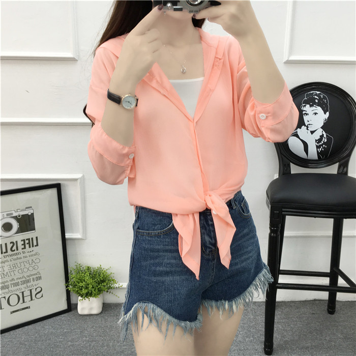 / 2017新款韓版短袖雪紡襯衫女寬松百搭學生中長款襯衣夏七分袖上衣