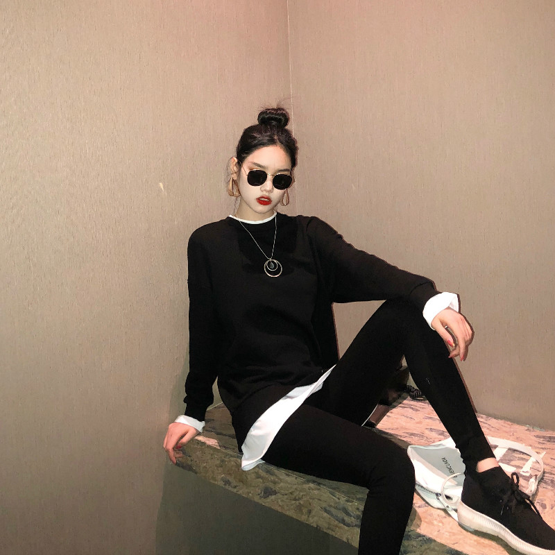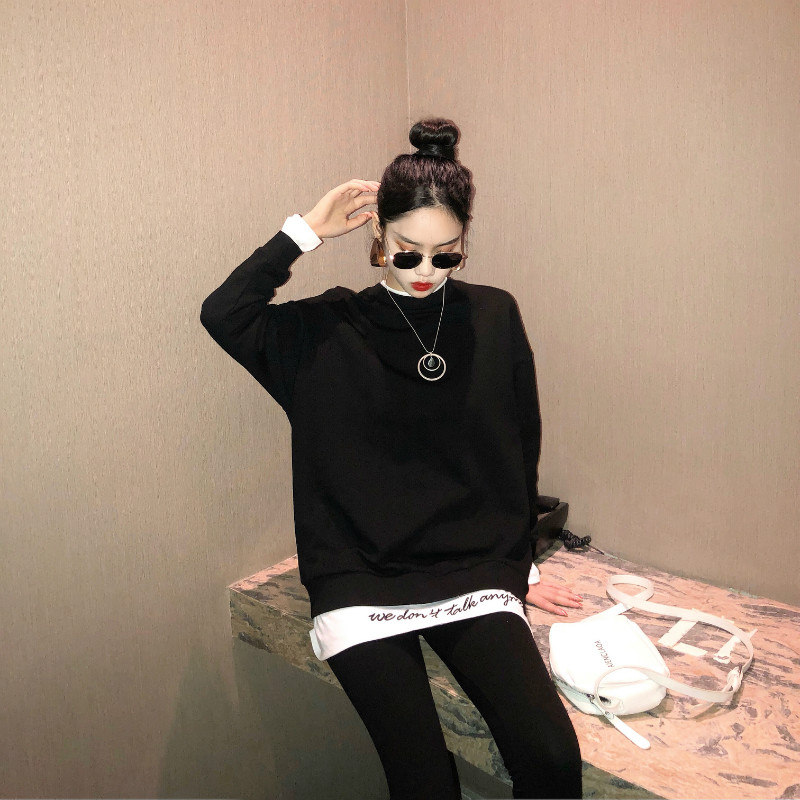 韓國復古風寬松顯瘦字母印花假兩件衛衣時尚套裝百搭修身打底褲女