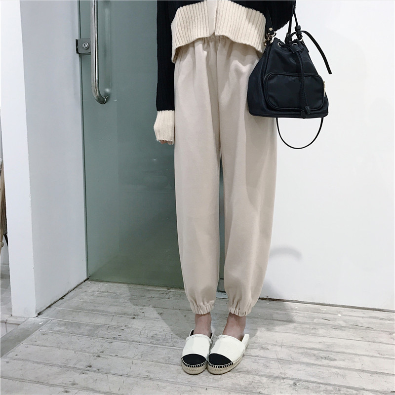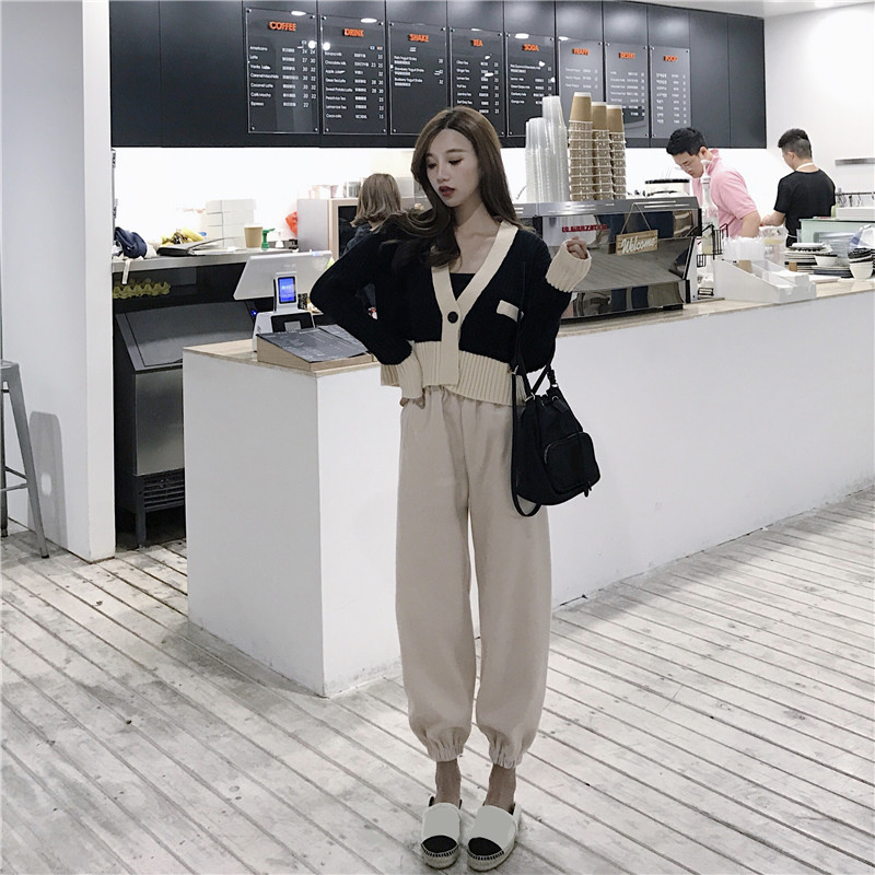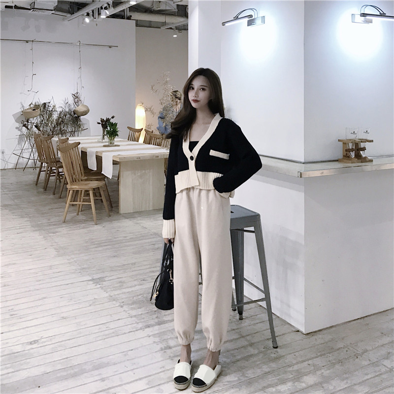 新款拼色短款V領開衫針織外套休閑高腰毛呢束腳哈倫蘿卜褲兩件套