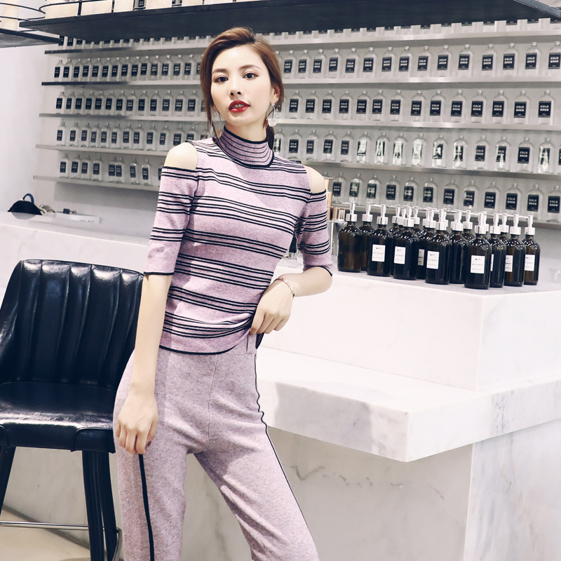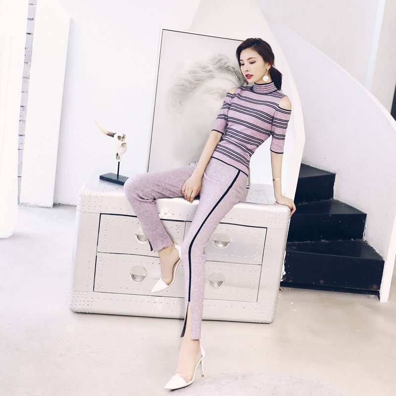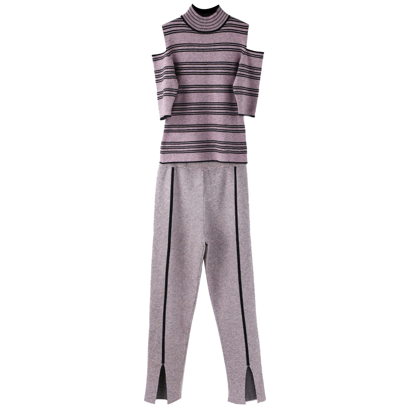 / 歐洲站2018秋季新款休閑女套裝露肩修身毛衣針織衫開叉小腳褲套裝