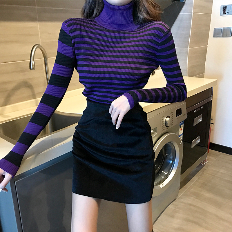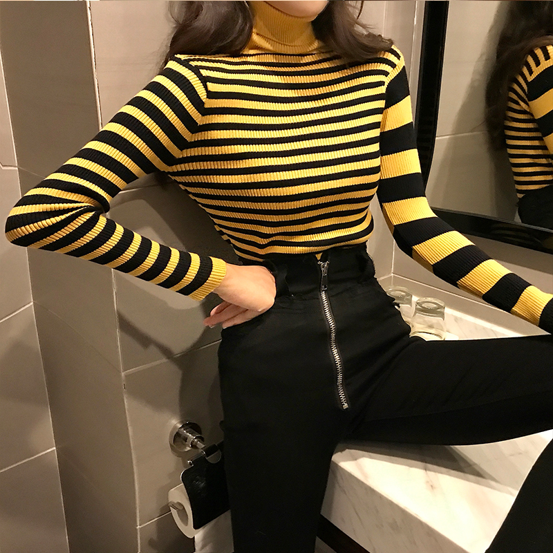 秋冬新款韓版百搭修身顯瘦高領條紋chic長袖上衣女百搭打底針織衫