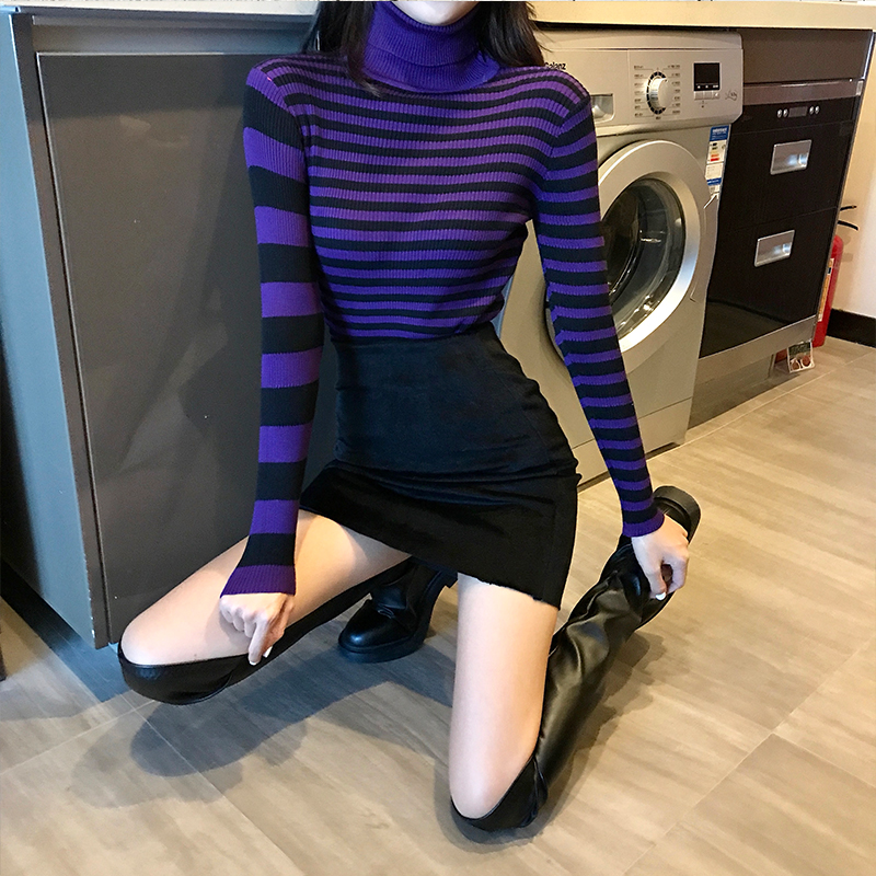 / 秋冬新款韓版百搭修身顯瘦高領條紋chic長袖上衣女百搭打底針織衫