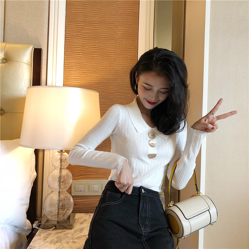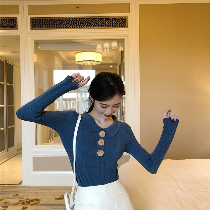 2018秋裝新款T恤女韓版修身顯瘦彈力翻領大紐扣針織外穿打底上衣