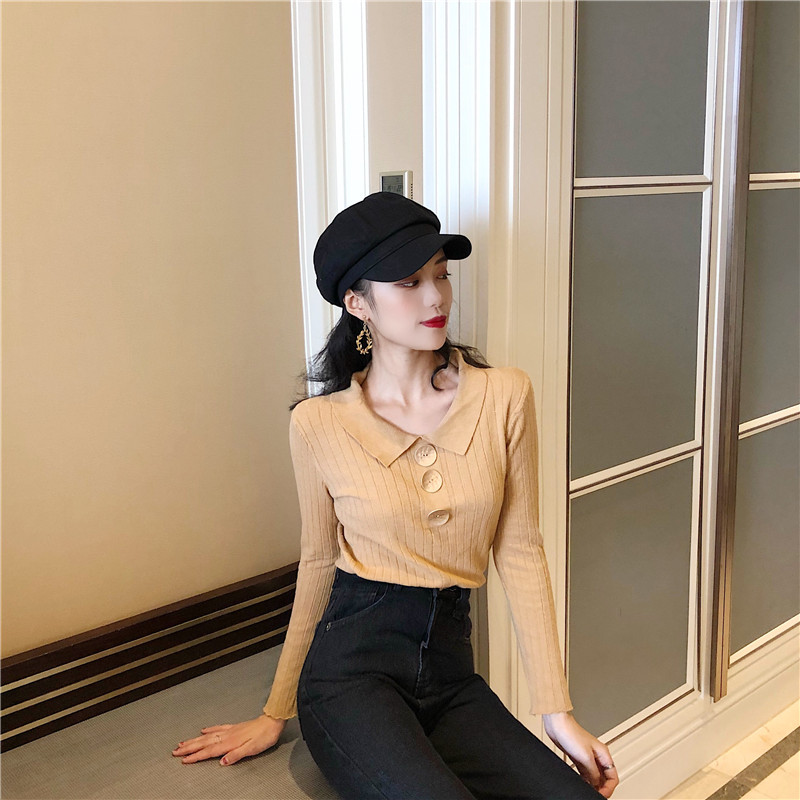/ 2018秋裝新款T恤女韓版修身顯瘦彈力翻領大紐扣針織外穿打底上衣