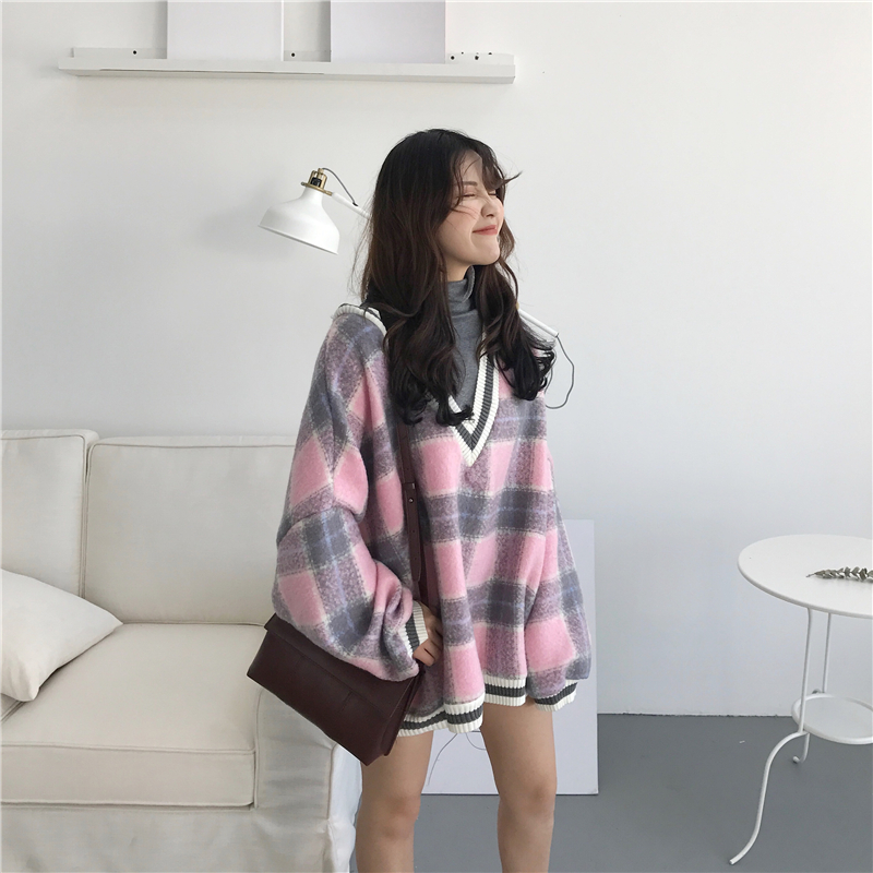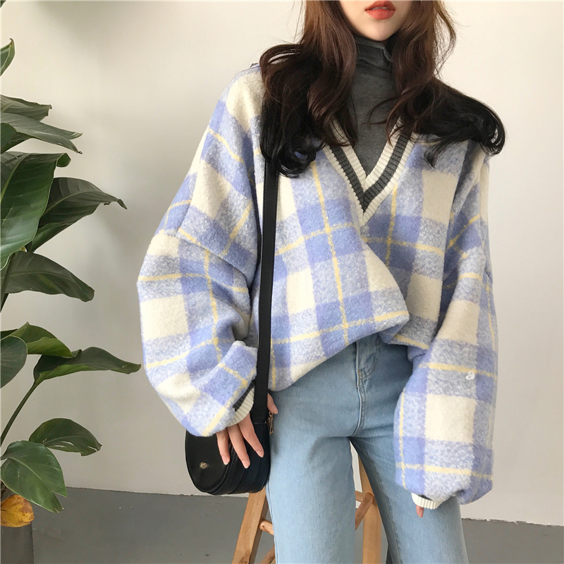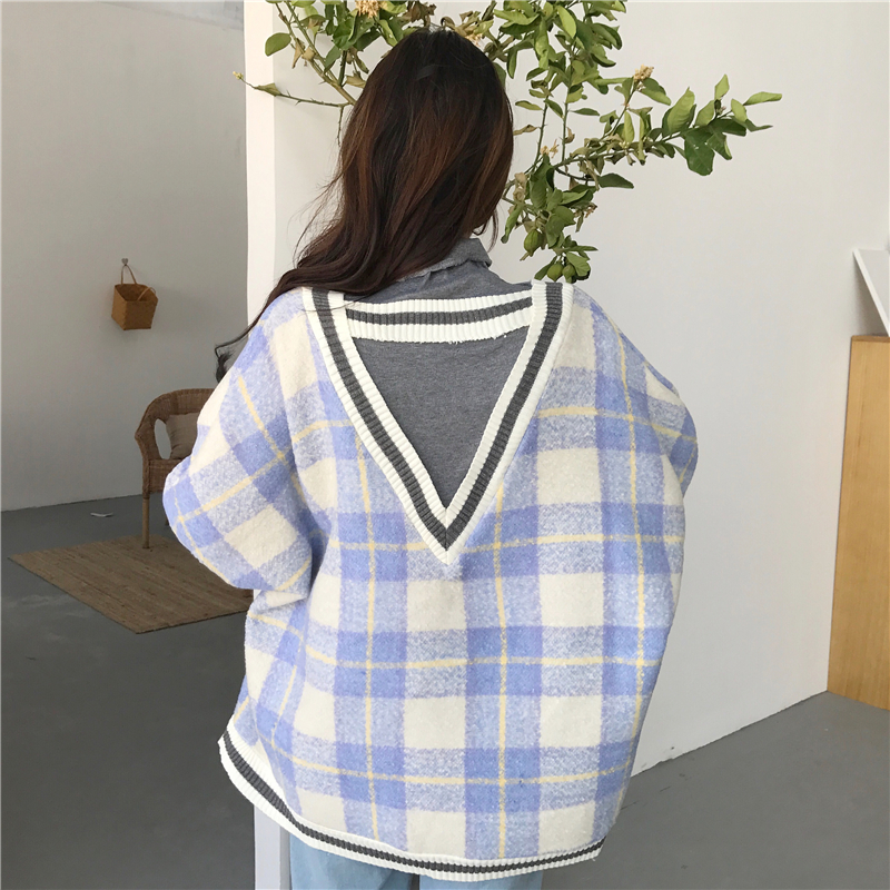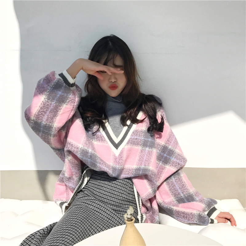 / 韓國ulzzang新款秋季百搭寬松假兩件設計感V領格子呢料套頭衛衣女
