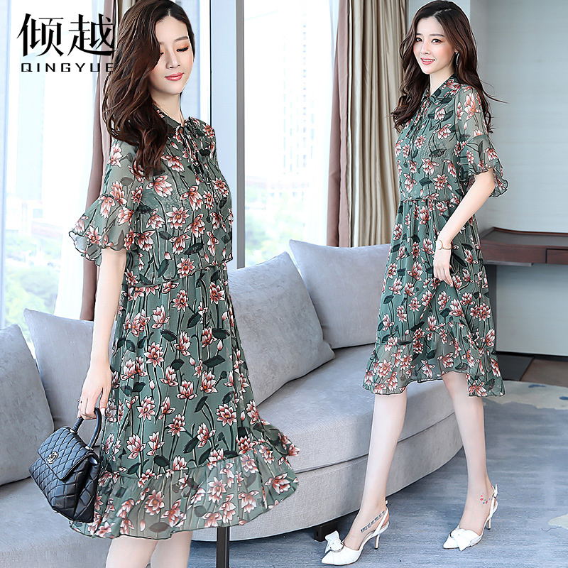 / 2017夏季新款淑女系帶套頭印花荷葉邊中長款雪紡連衣裙套裙兩件套