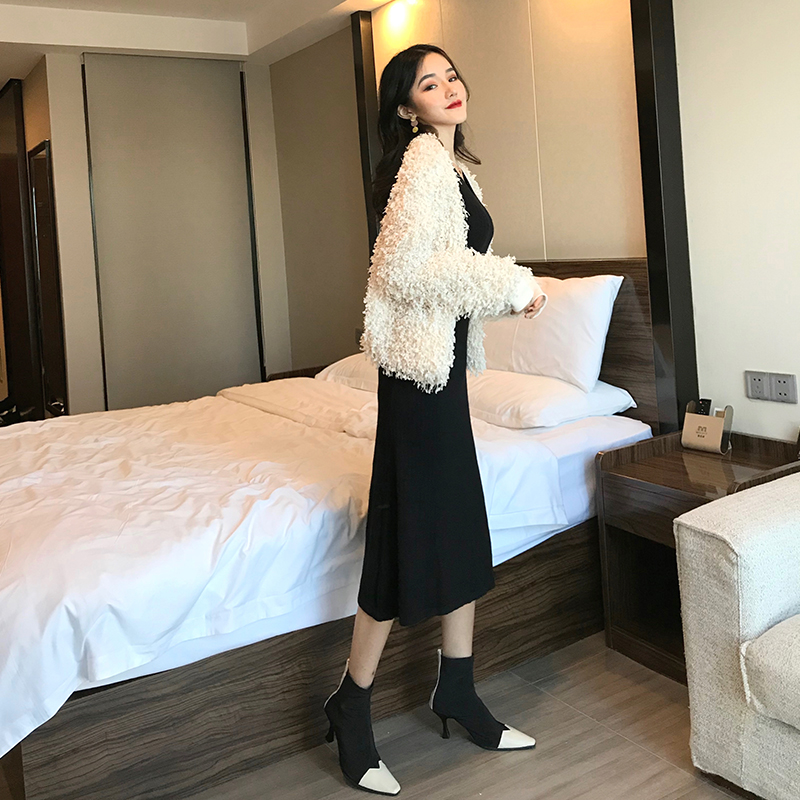 2018秋冬新款韓版時尚套裝毛毛開衫外套V領吊帶連衣裙chic兩件套