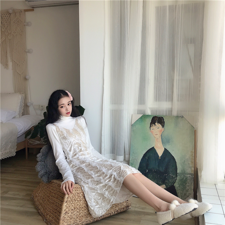 / 韓版時尚V領修身打底中長款性感吊帶連衣裙+純色針織打底衫兩件套