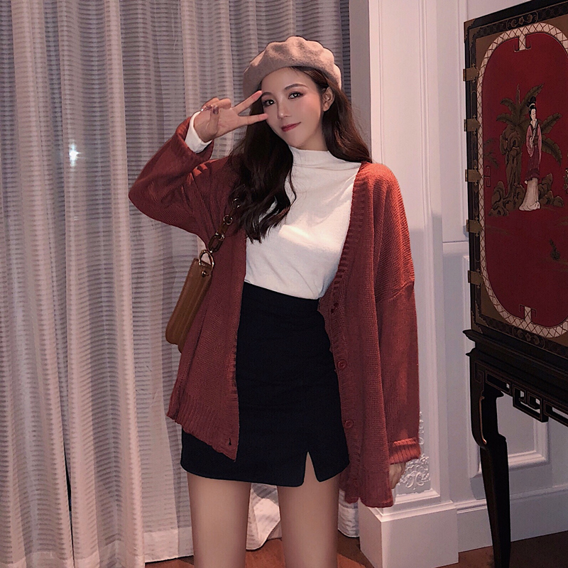 / 秋裝新款韓版時尚套裝寬松V領單排扣開衫包臀半身裙純色打底衫女