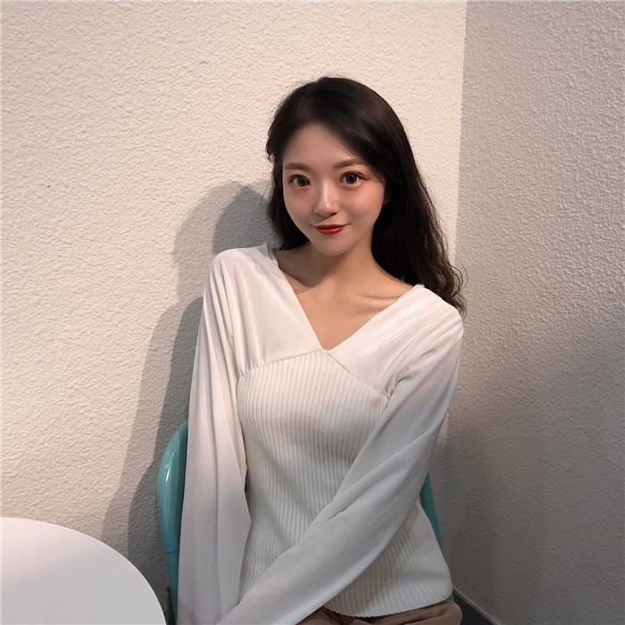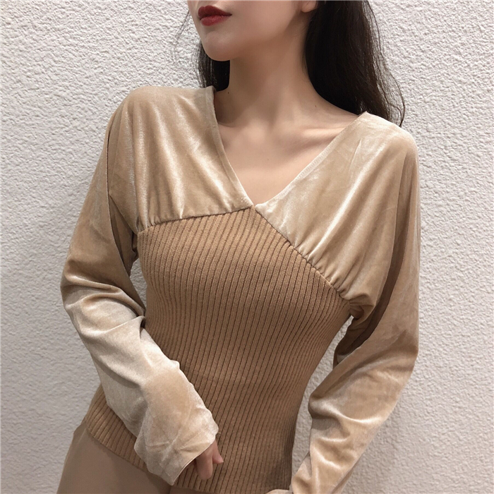 / 冬裝上衣女慵懶長袖t袖女氣質V領收腰針織拼接絲絨高腰短款打底衫