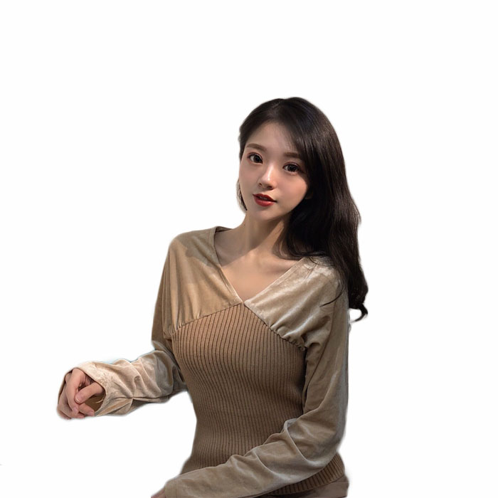 冬裝上衣女慵懶長袖t袖女氣質V領收腰針織拼接絲絨高腰短款打底衫