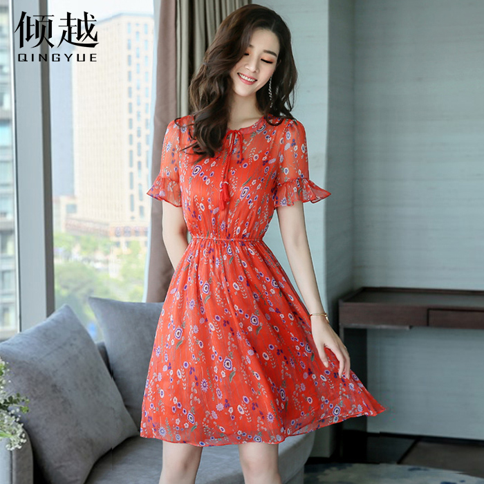 / 2017新款雪紡印花A字裙短袖系帶收腰修身連衣裙夏小清新碎花中裙