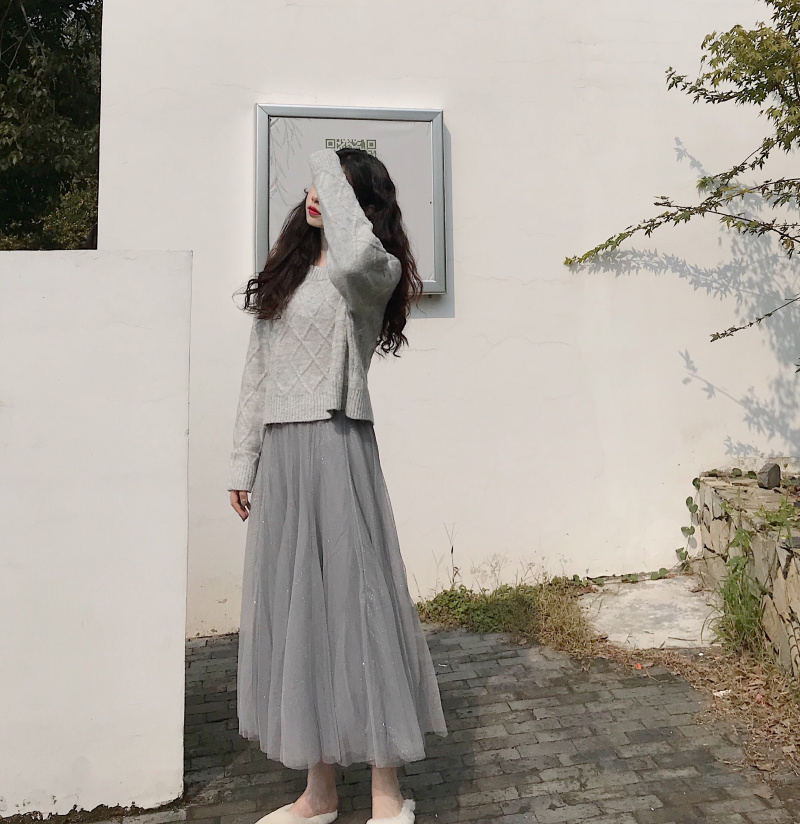 冬季新款寬松圓領套頭菱形針織毛衣高腰中長款星星網紗裙時尚套裝