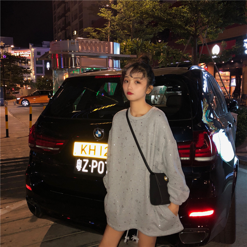 2018新款秋冬韓版中長款寬松閃亮星星加絨加厚套頭衛衣上衣外套女