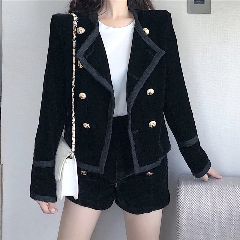 / 2018秋季港味新款名媛小香風金絲絨外套排扣金絲絨短褲時尚套裝女