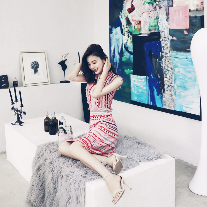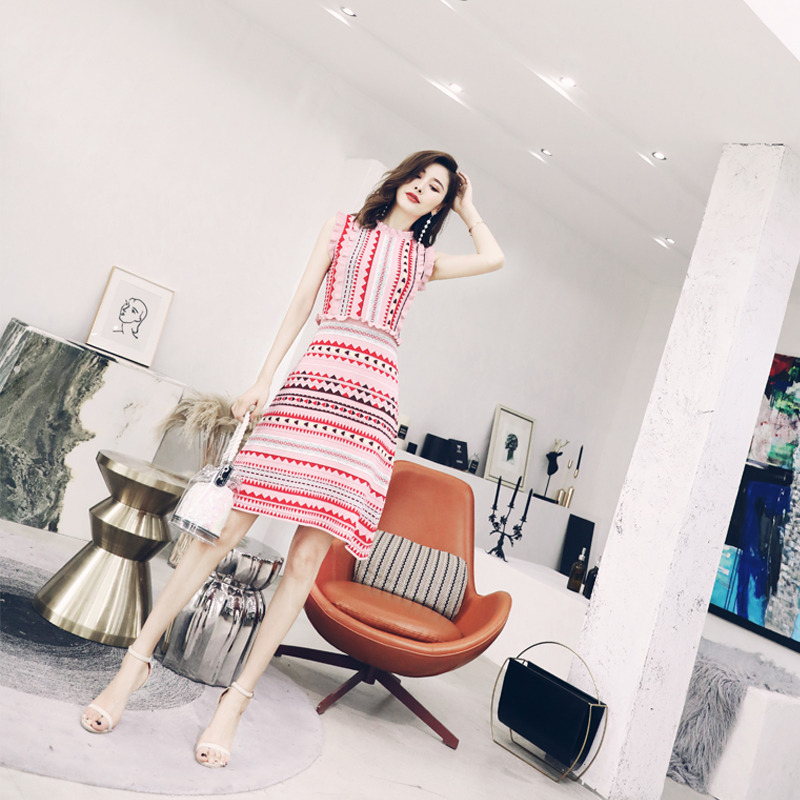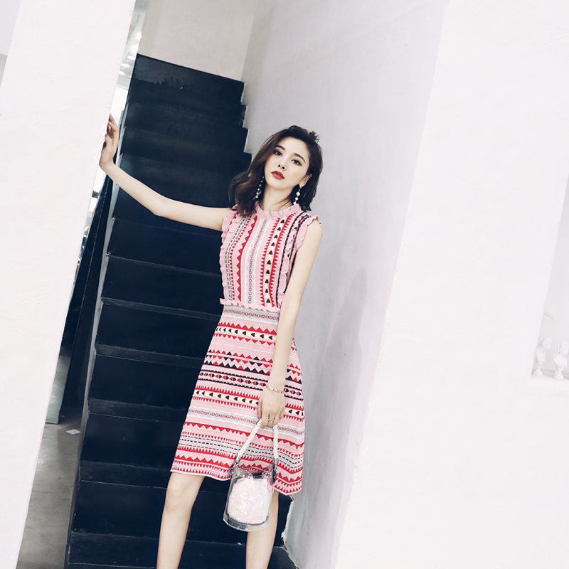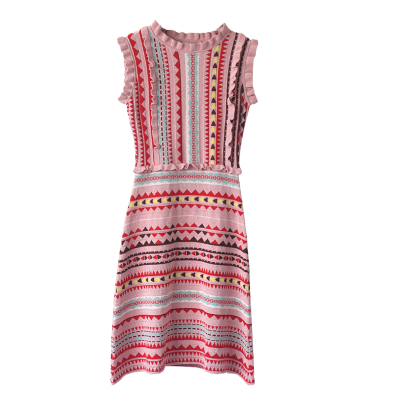 / 18夏季新款復古波西米亞民族風彩虹條紋木耳邊針織無袖收腰連衣裙