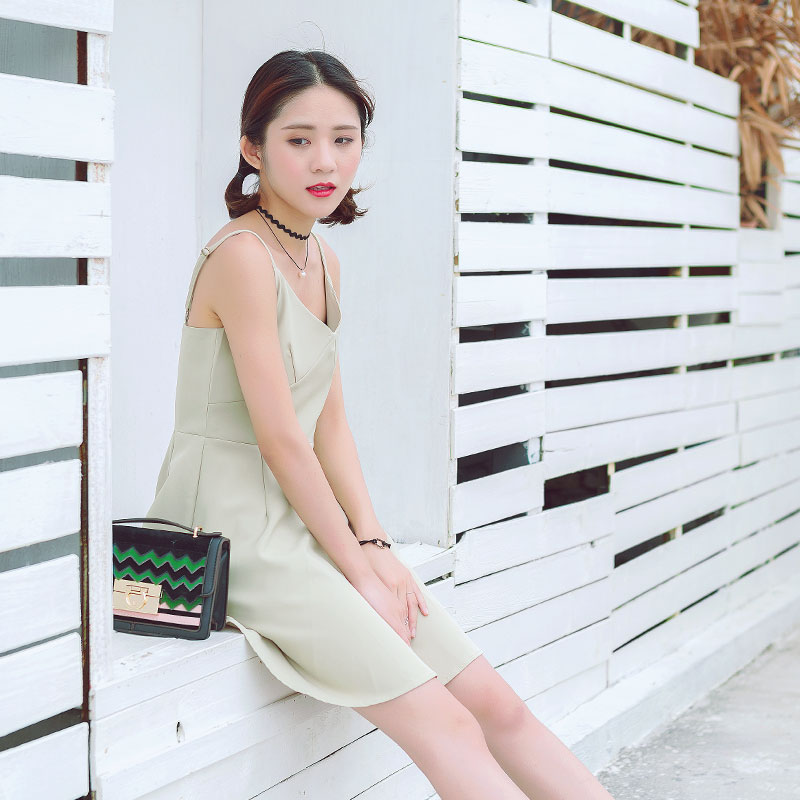 夏季新款韓版女裝吊帶連衣裙綠色V領收腰顯瘦a字短中長款裙子