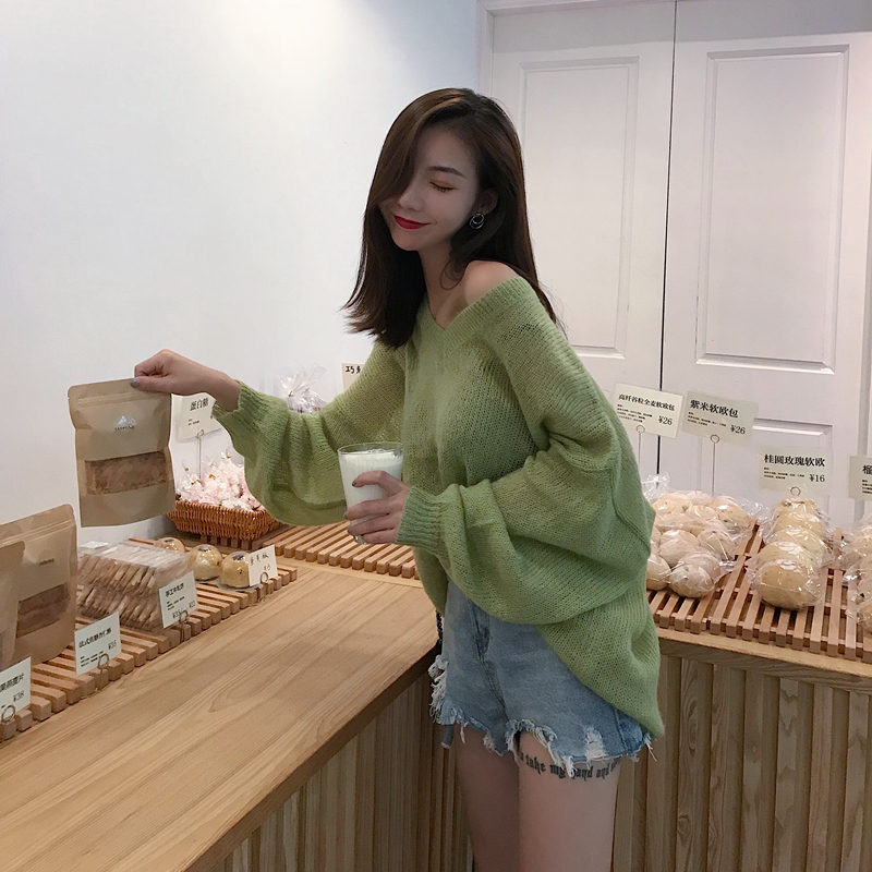 2018秋裝新款韓版百搭復古chic上衣寬松套頭慵懶風V領長袖毛衣女