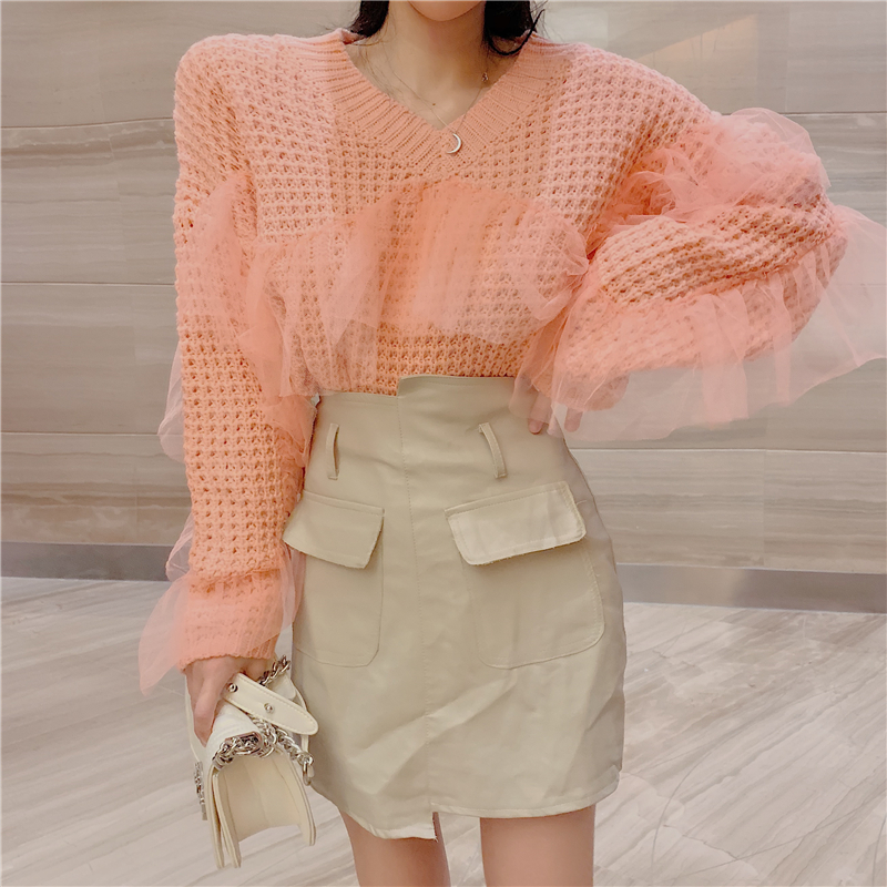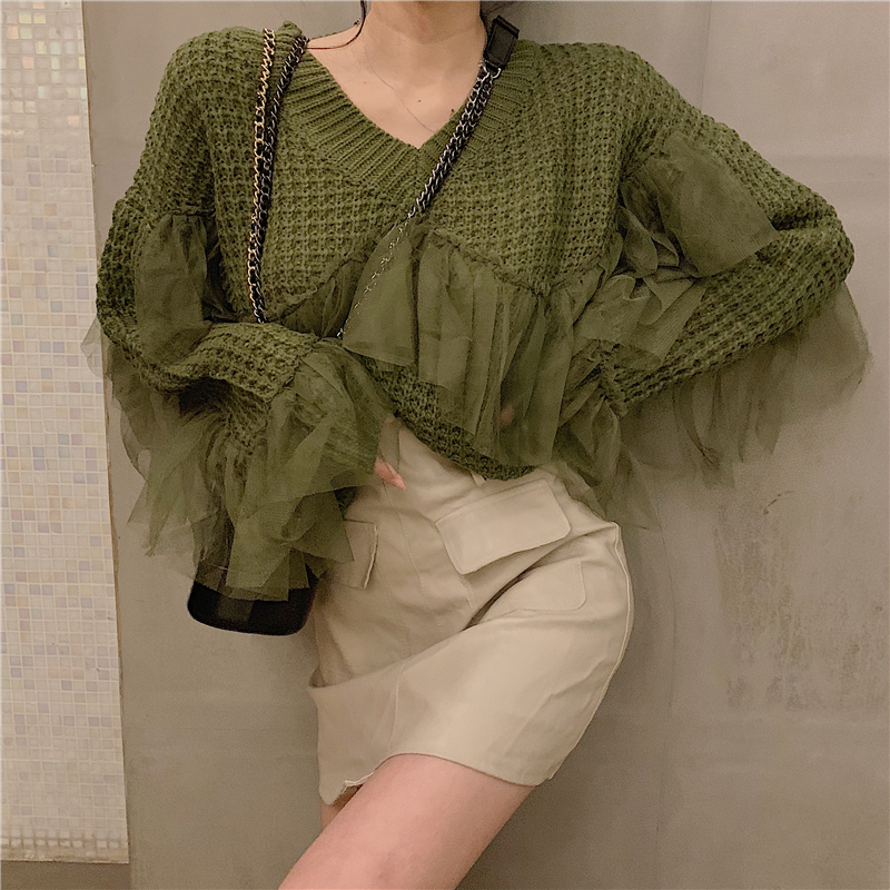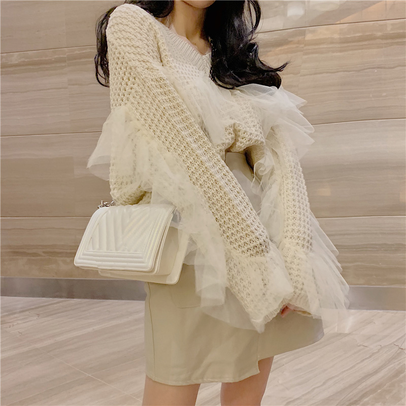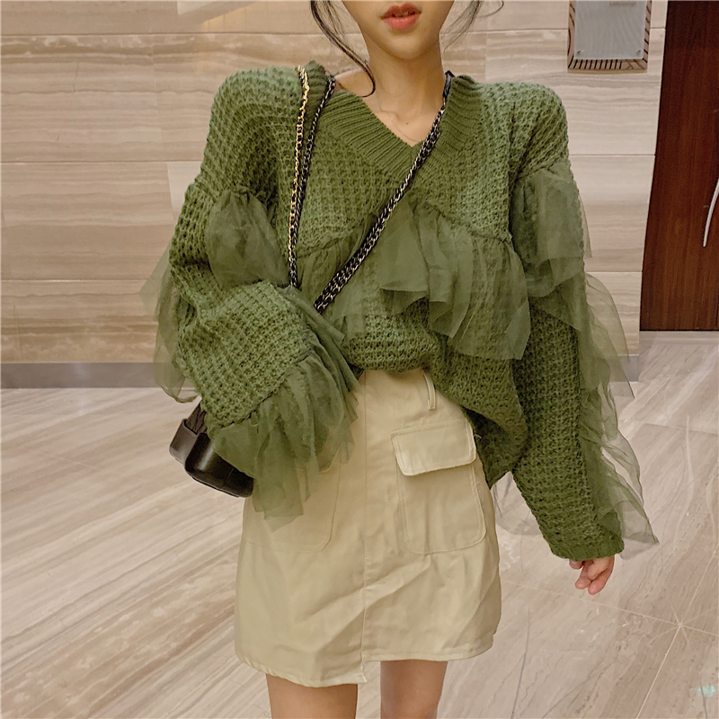 秋冬新款時尚甜美網紗拼接V領套頭寬松針織衫百搭純色長袖毛衣女