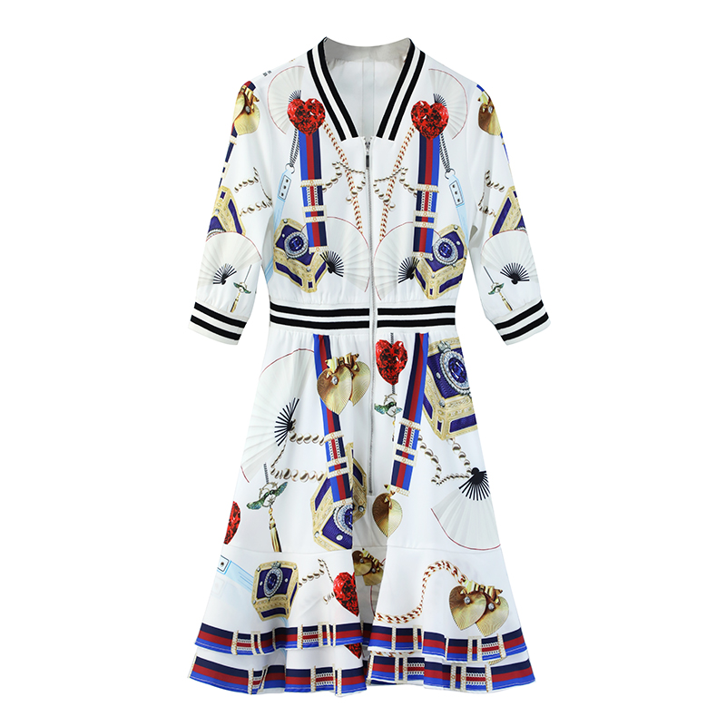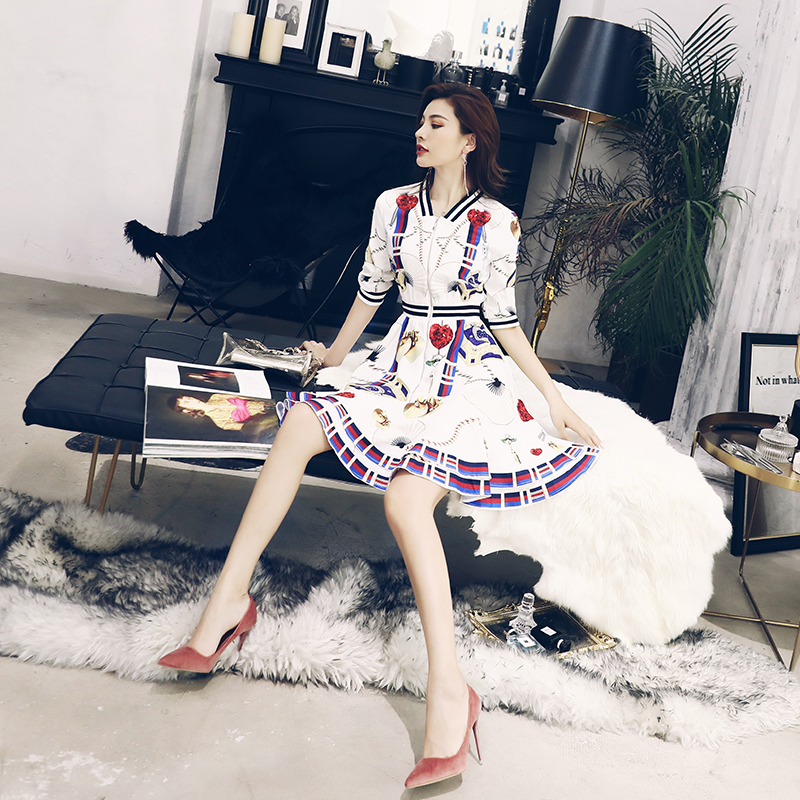 / 歐洲站2018早秋裝新款收腰連衣裙女休閑V領印花心機5分袖chic裙子